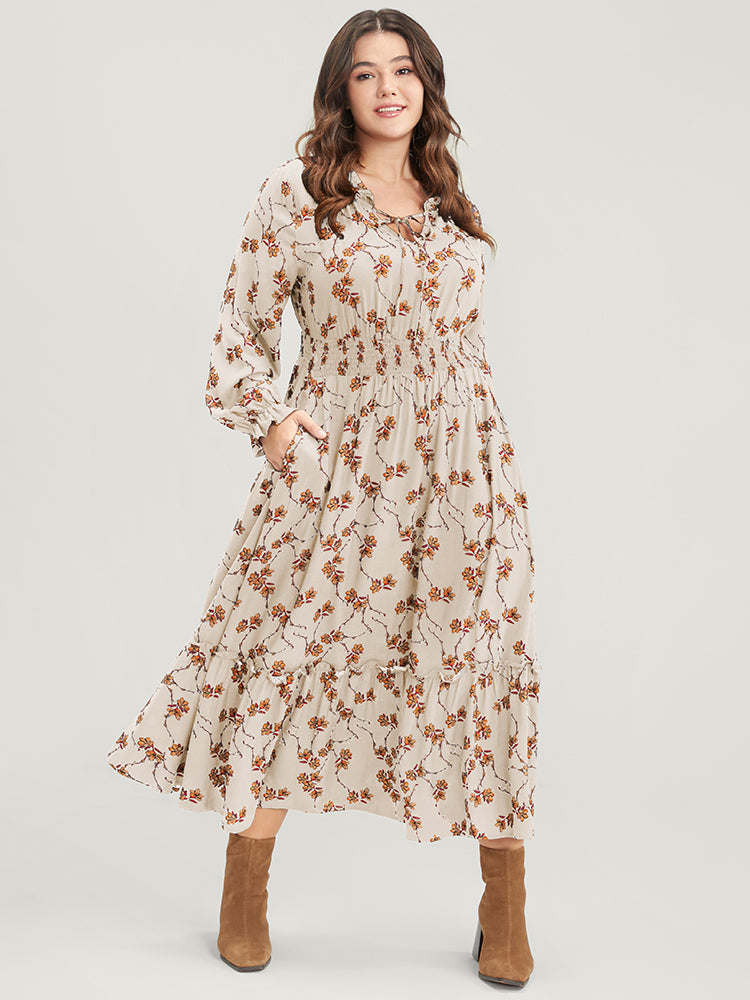 Floral Lantern Sleeve Pocket Tie Neck Shirred Midi Dress