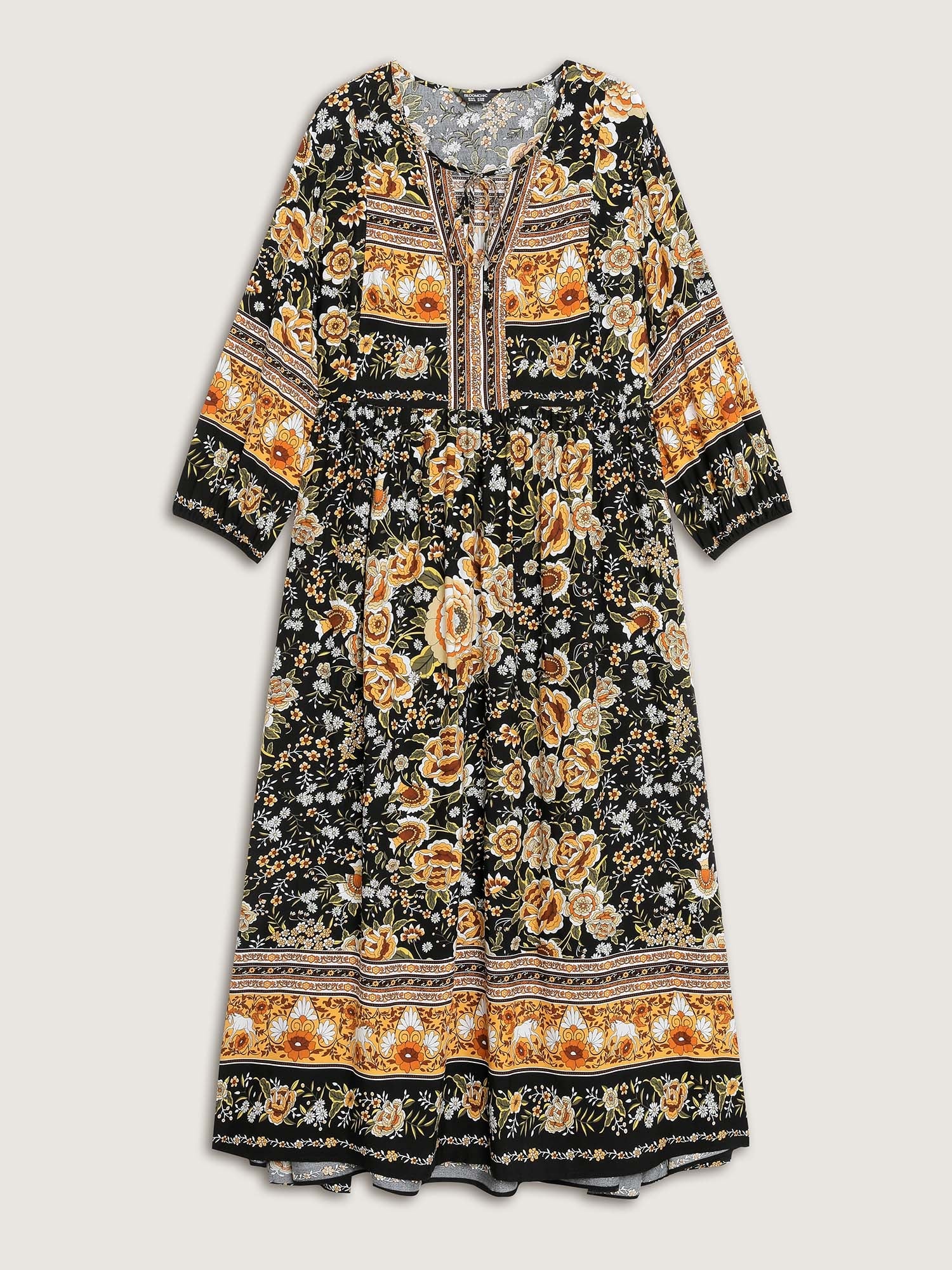 Floral Print Contrast Puffy Sleeve Maxi Dress