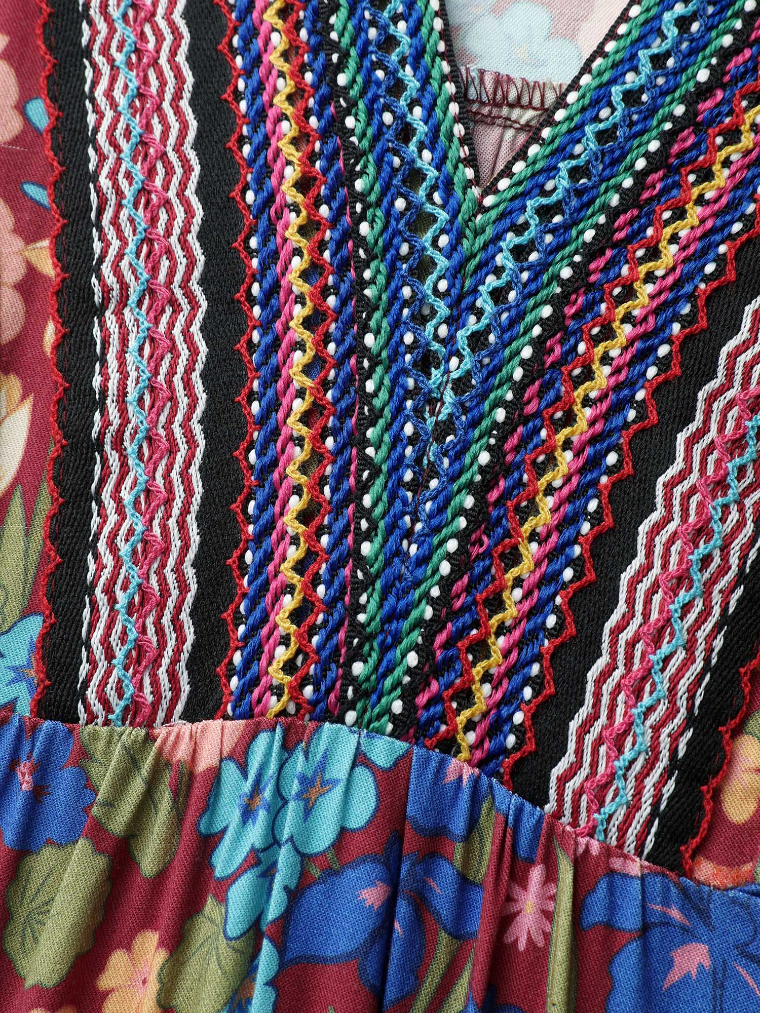 Floral Print Contrast Webbing Notched Neckline Blouse