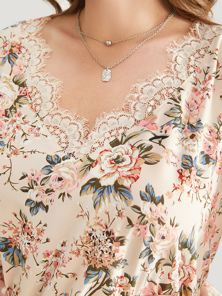 Floral Print Lace Trim Ruffle Hem Petal Sleeve Blouse