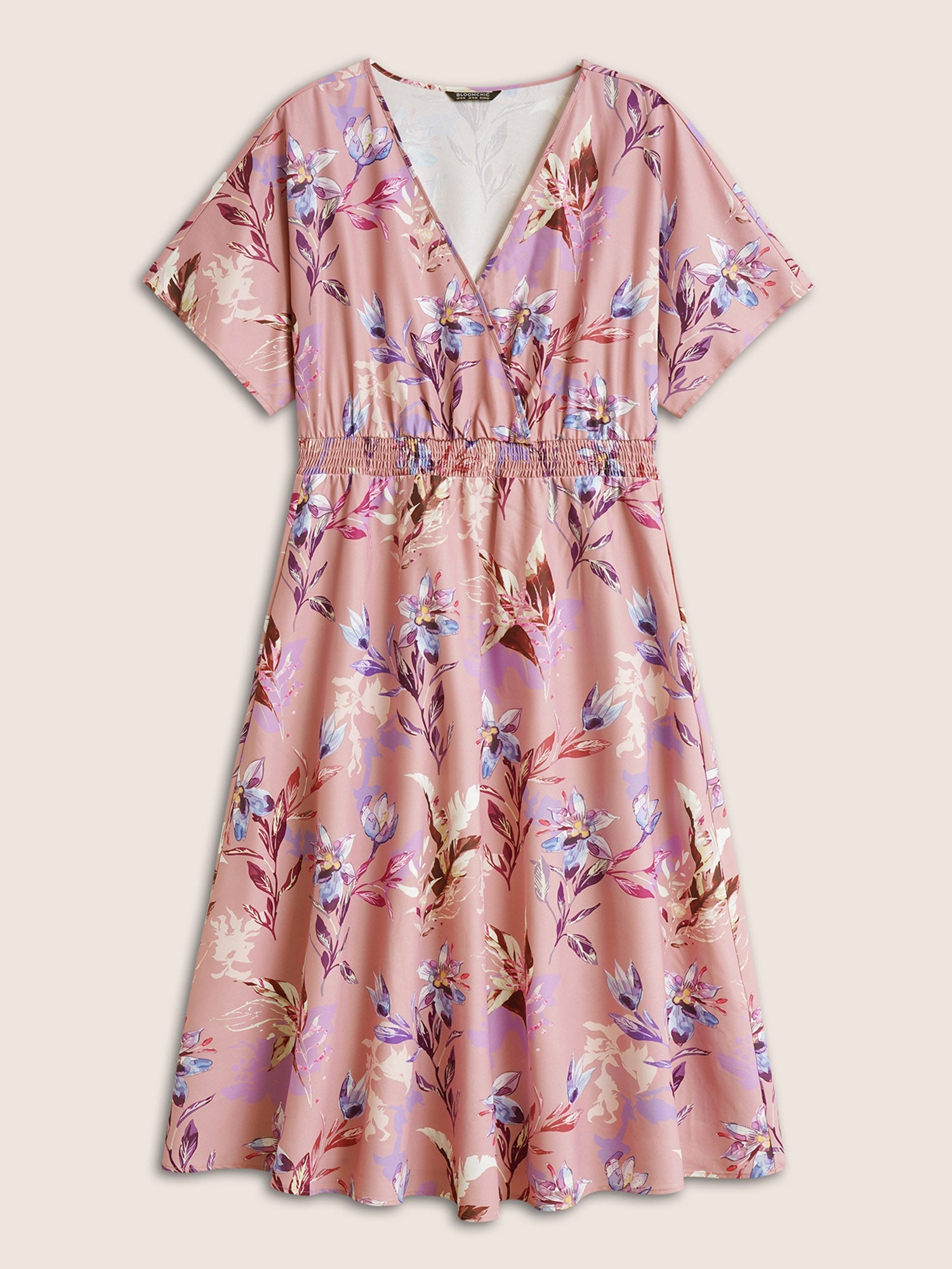 Floral Shirred Overlap Collar Elastic Waist Dress
