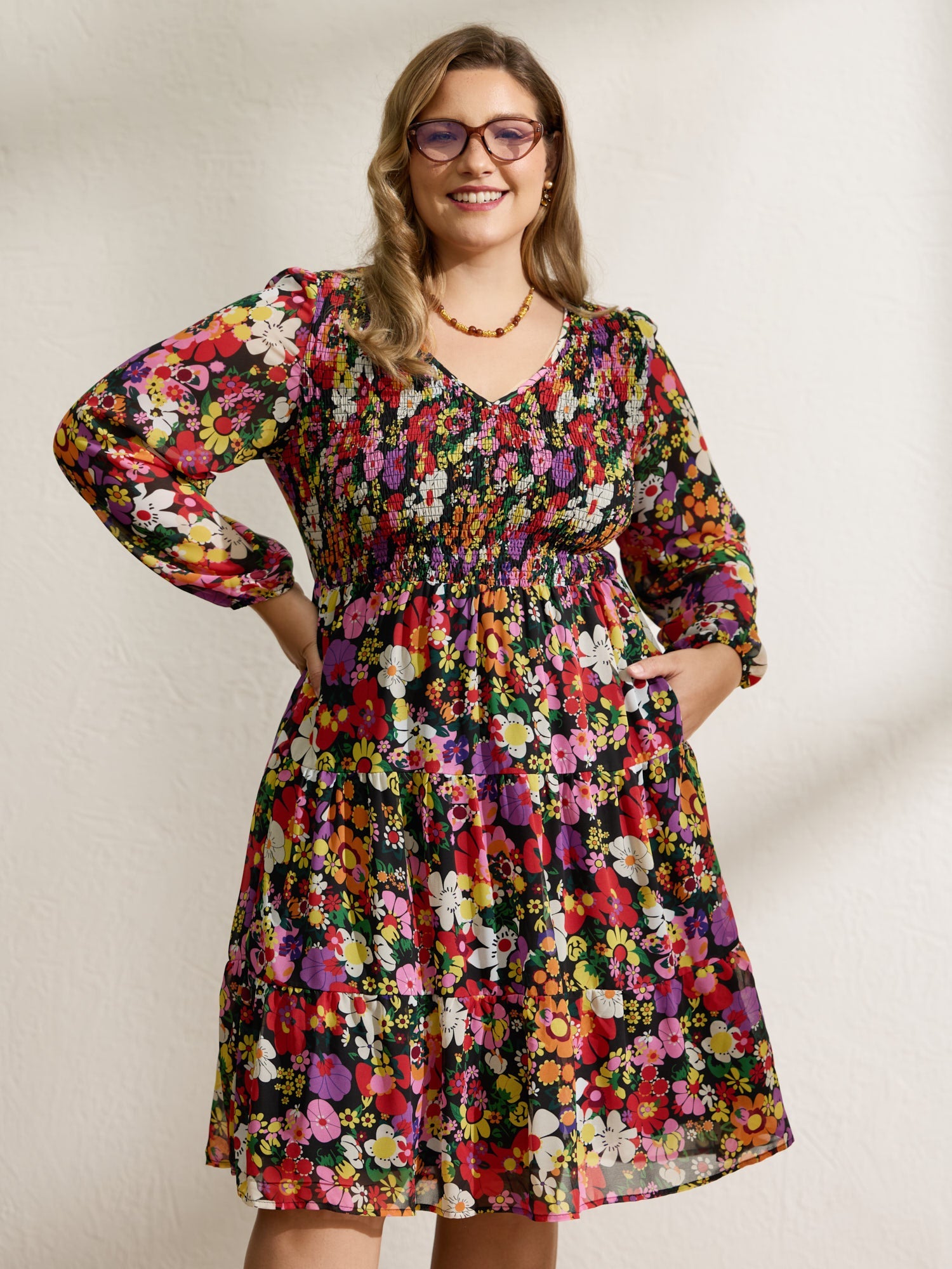 Floral Shirred Pockets Stretchy Waist Midi Dress