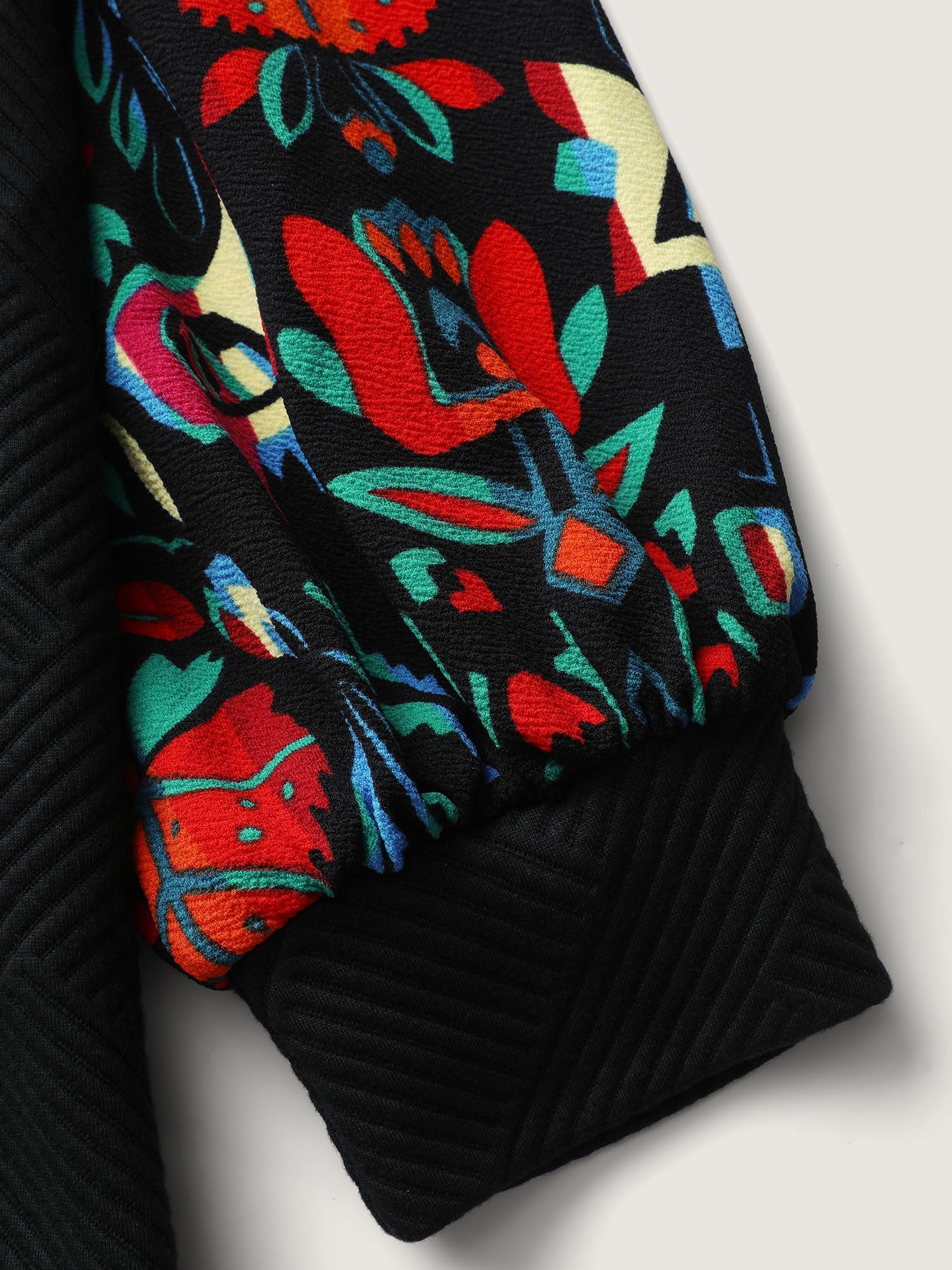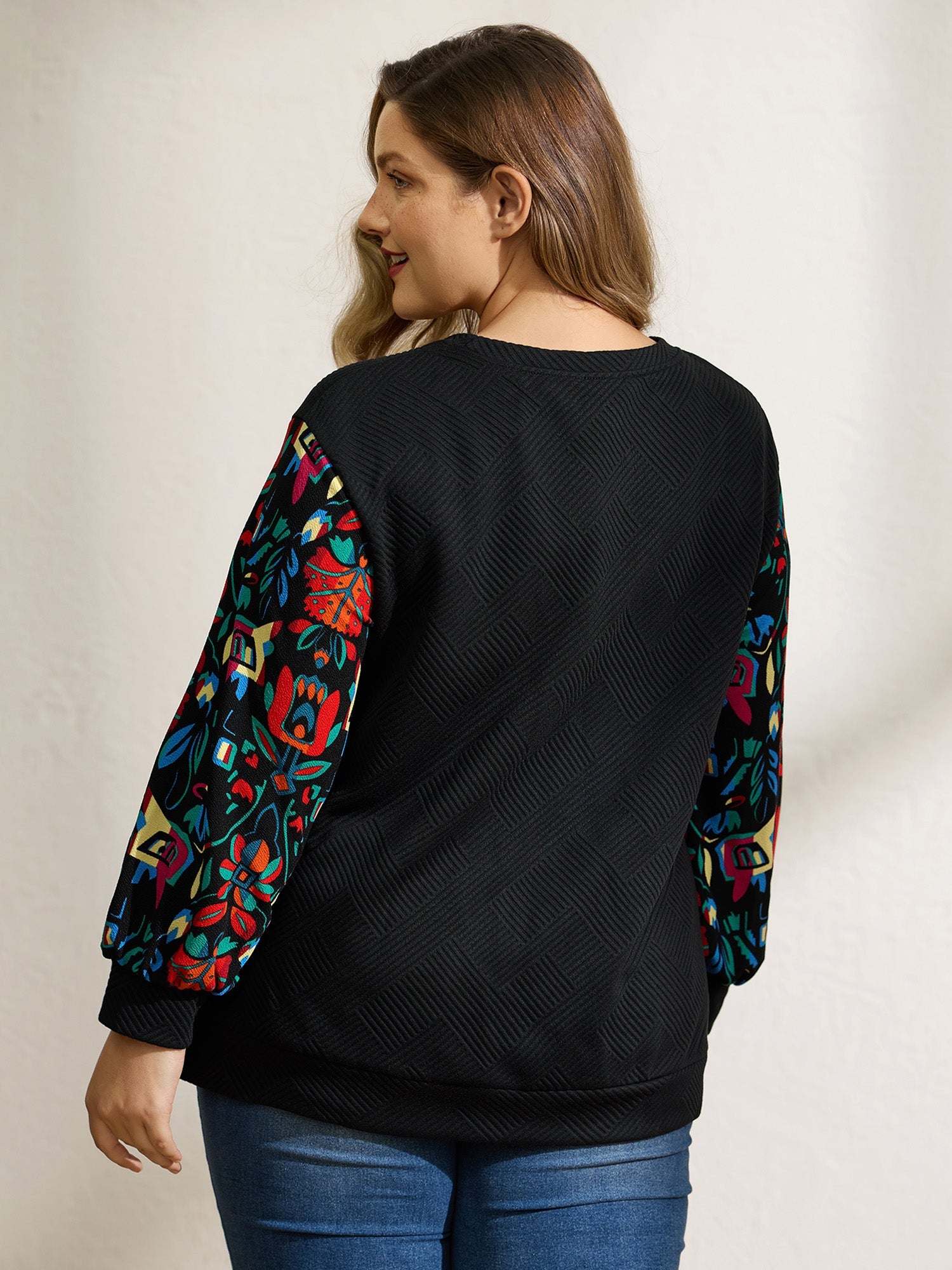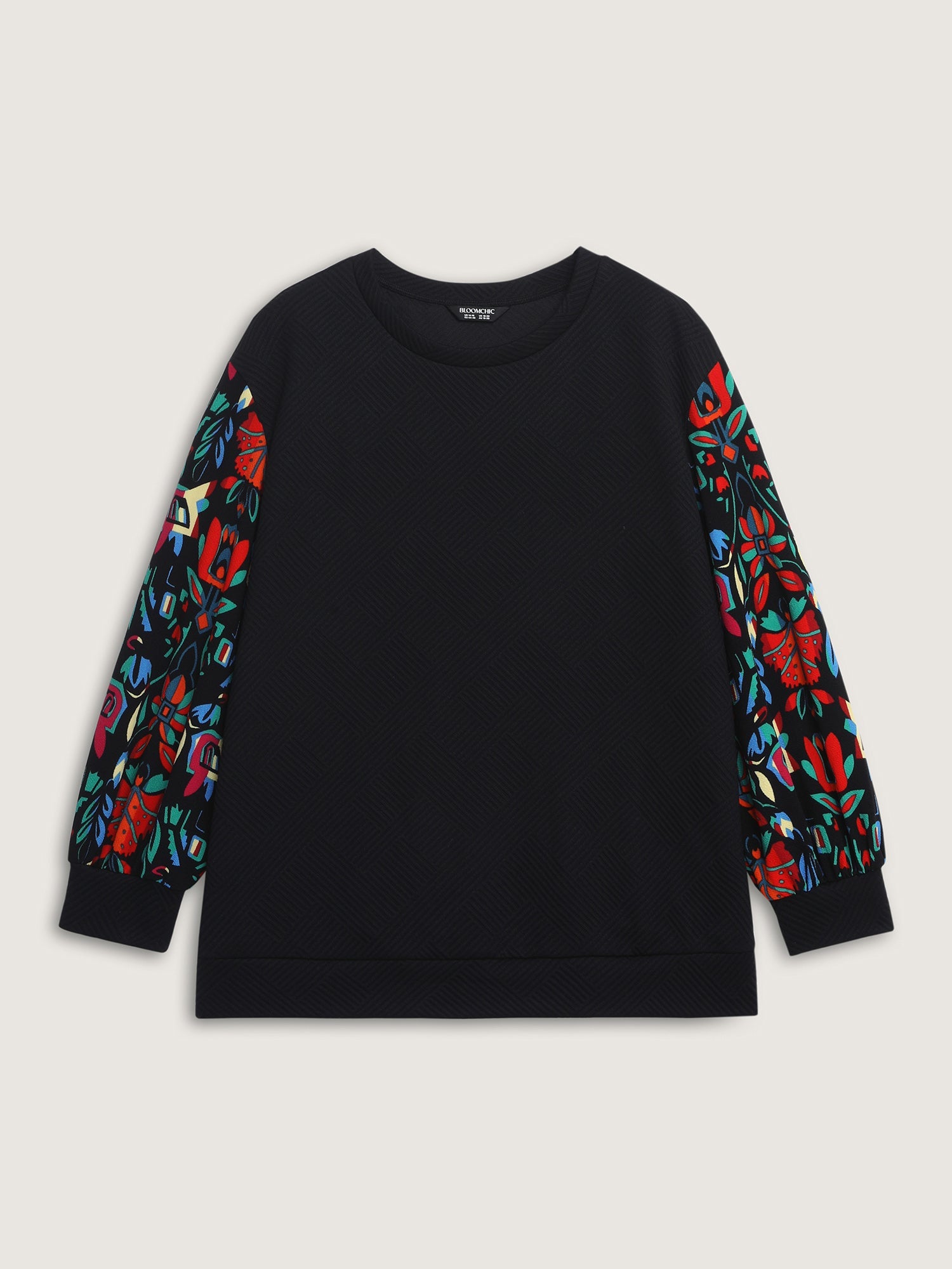 Floral Sleeve Drop Shoulder Textured Sweatshirt