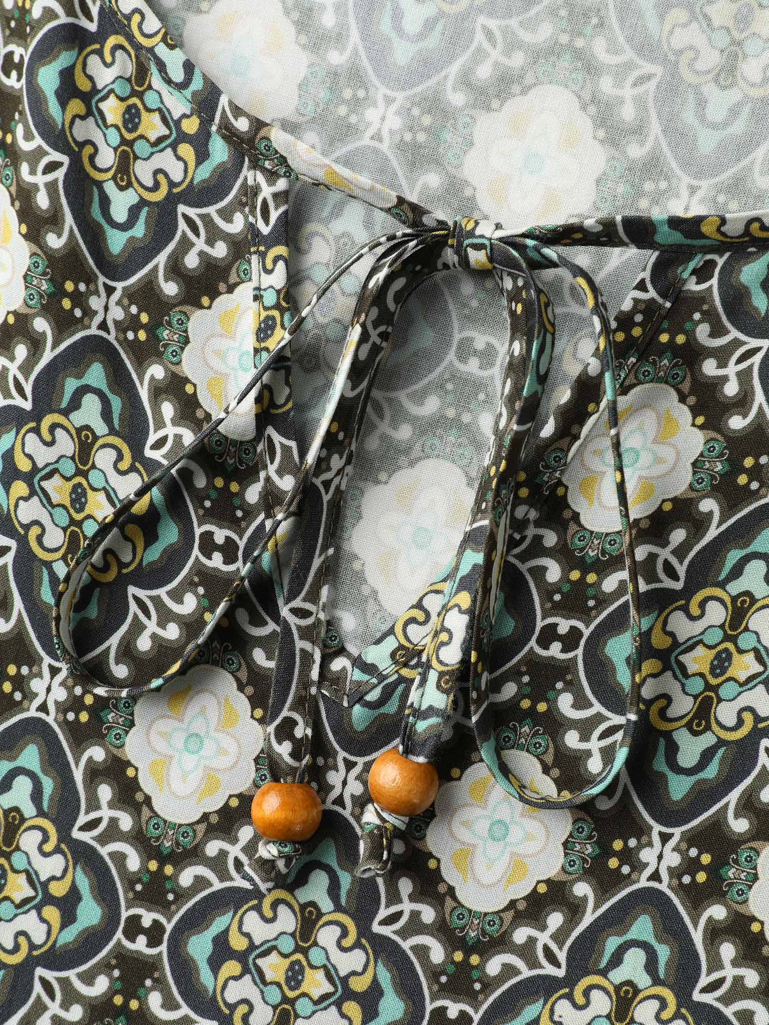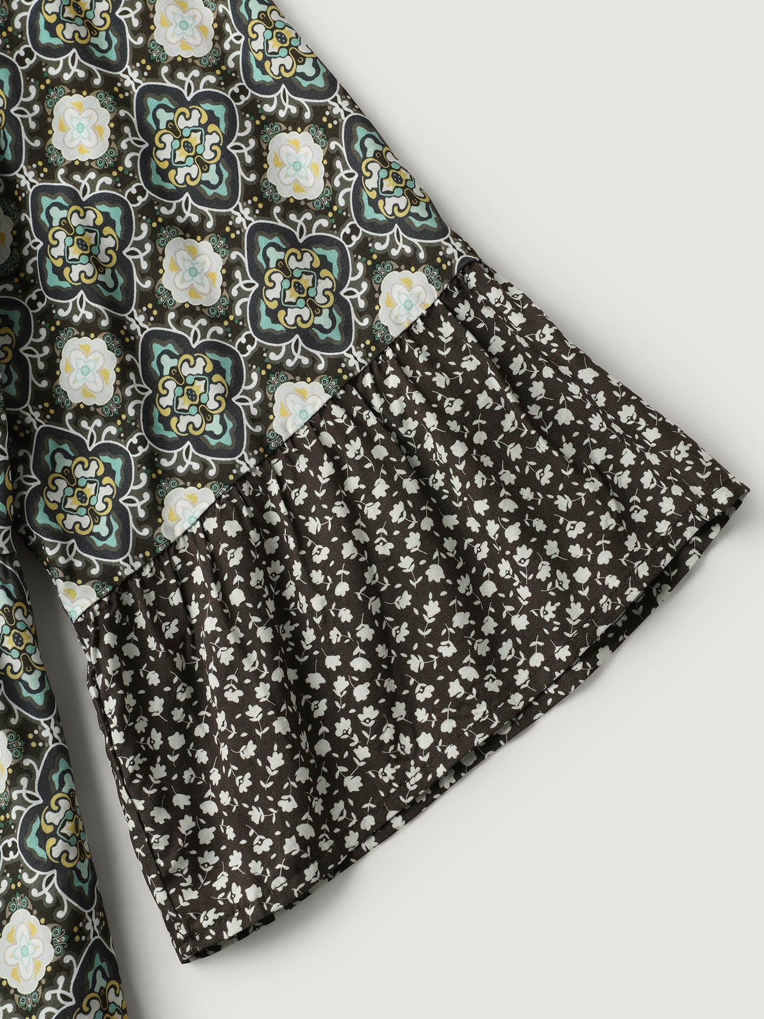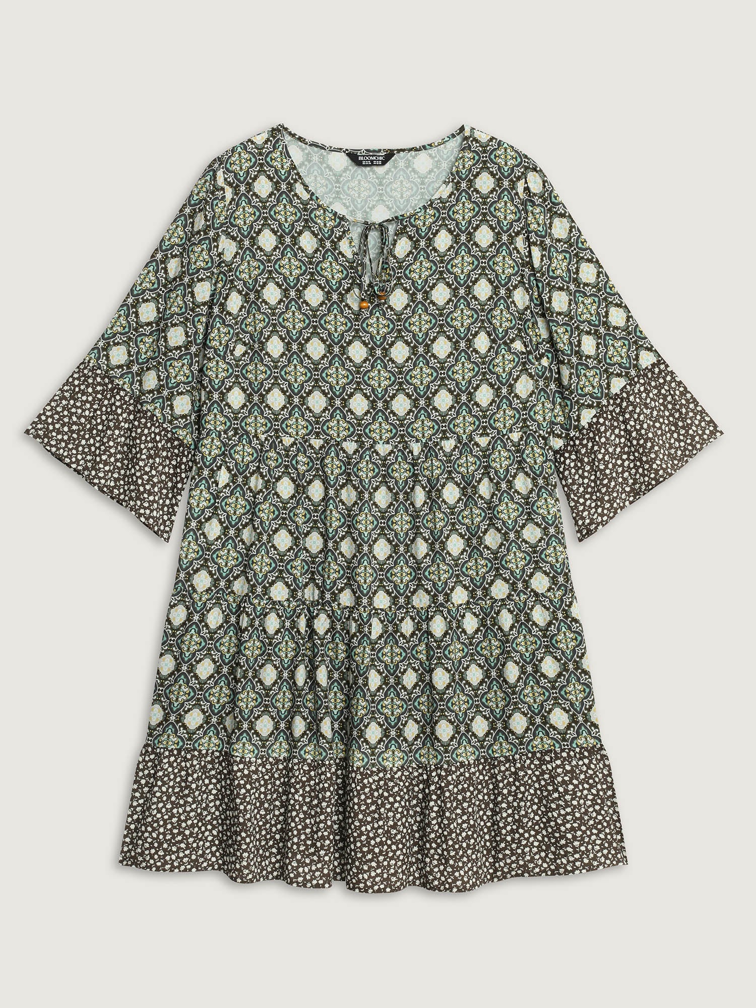 Geometric Print Flared Sleeve Tiered Midi Dress
