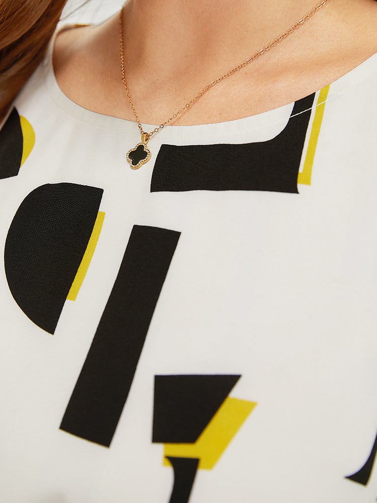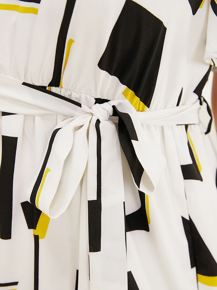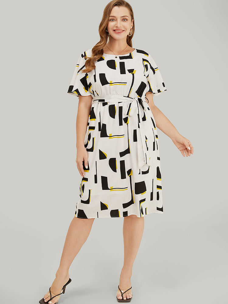 Geometric Print Pocket Belt Flutter Sleeve Dress