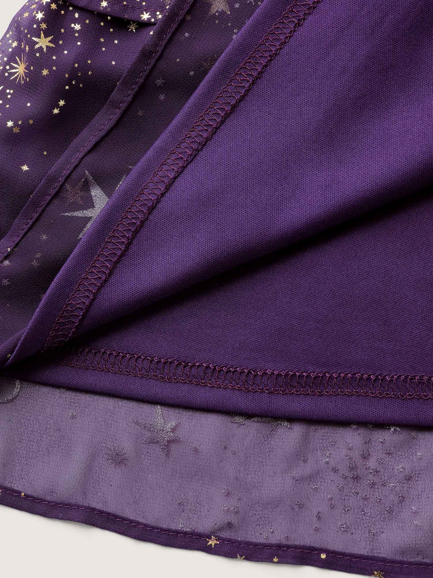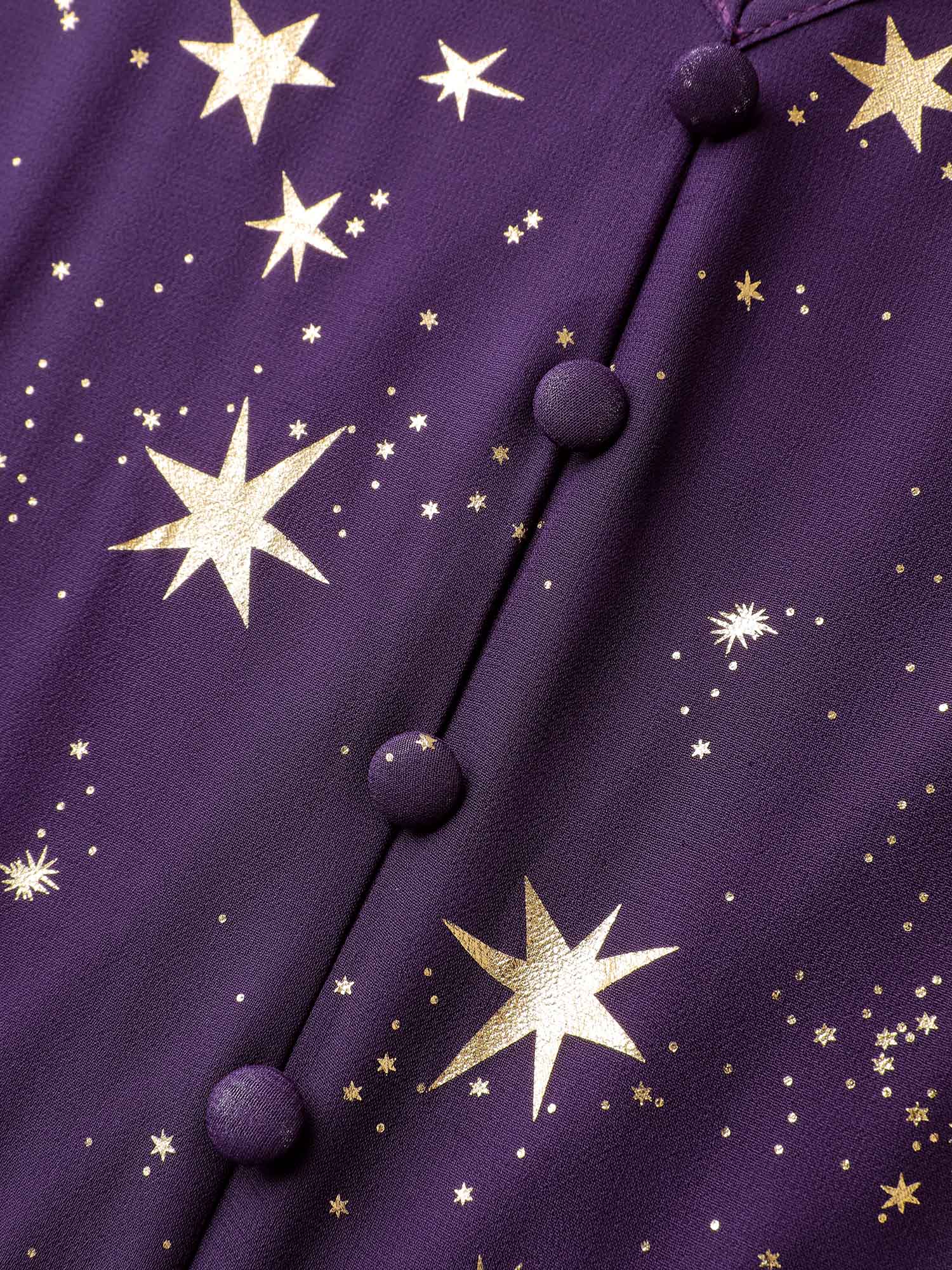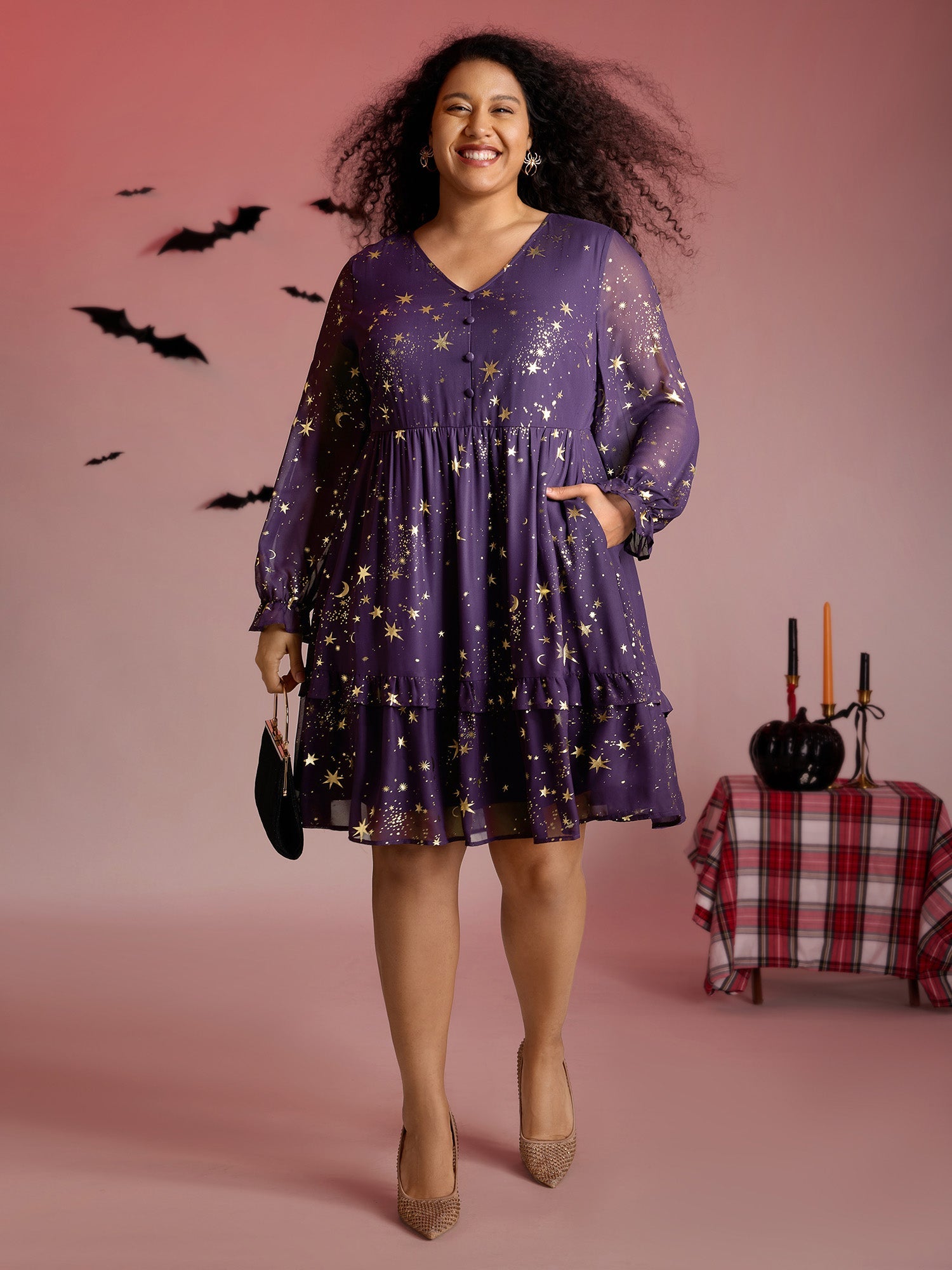 Gold Stamp Lantern Sleeve Ruffled Midi Dress