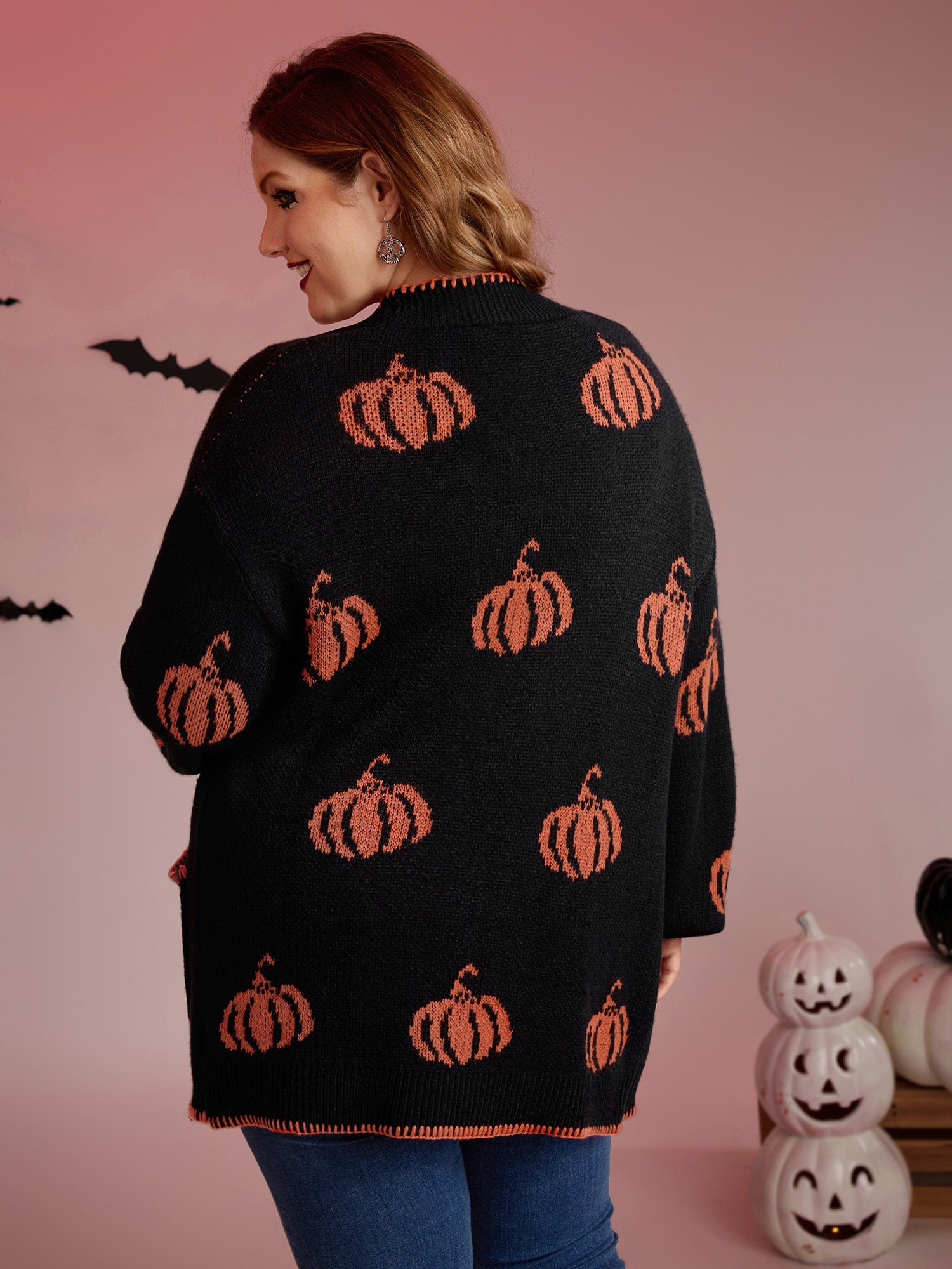 Halloween Pumpkin Print Contrast Knit Cardigan
