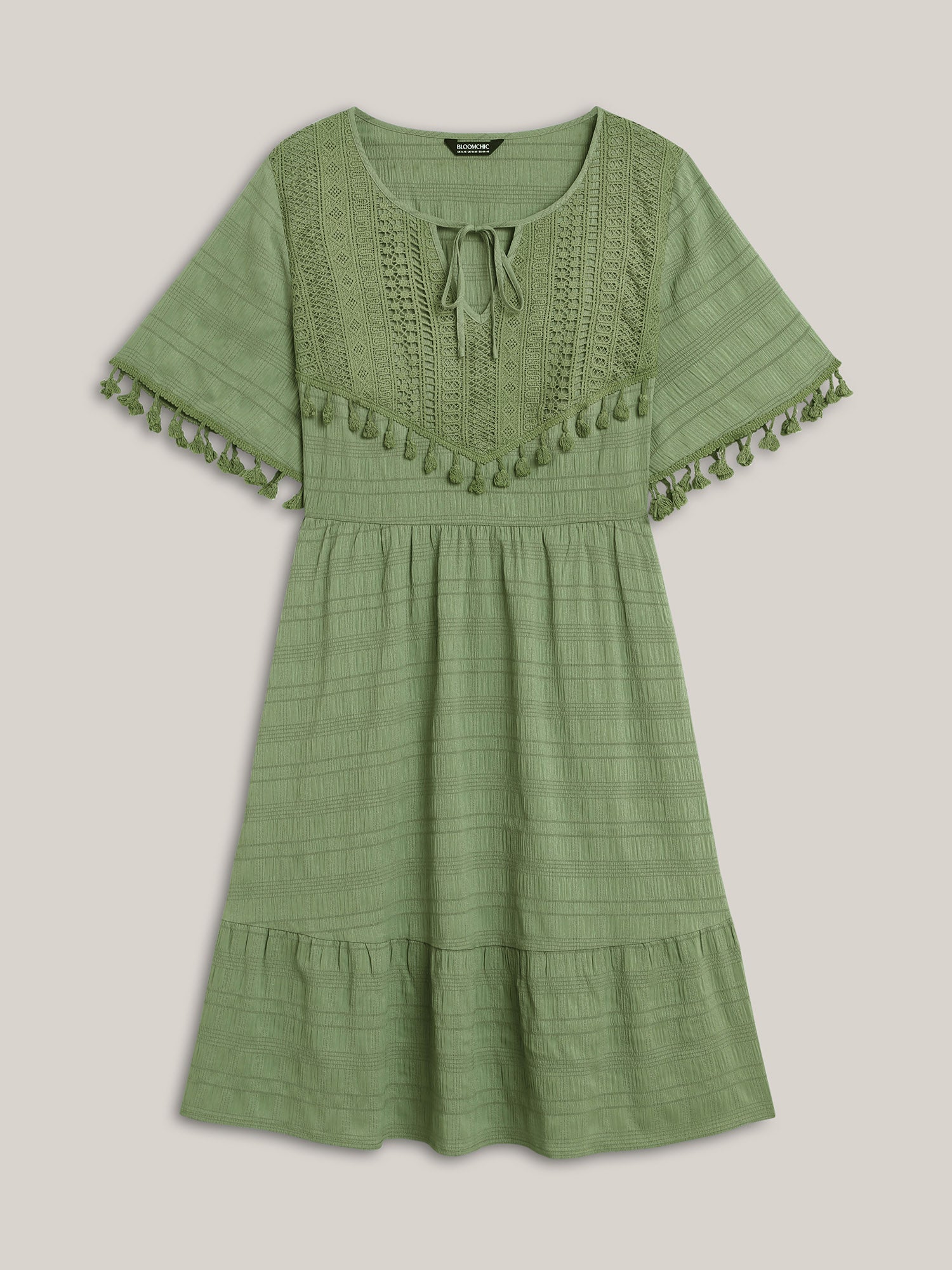 Lace Neck-Tie Pockets Tiered Midi Dress