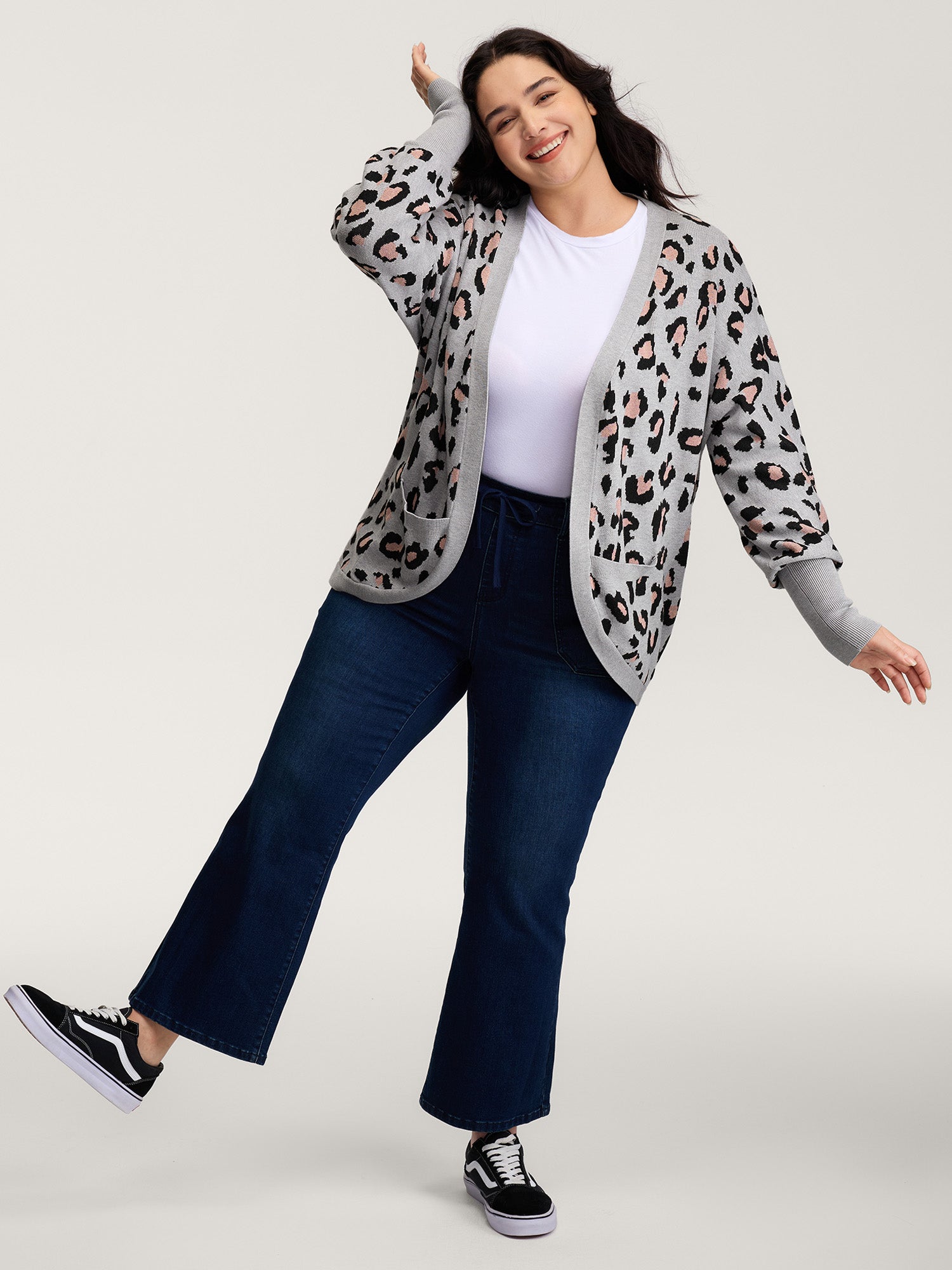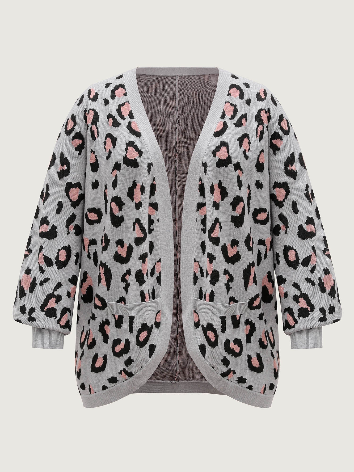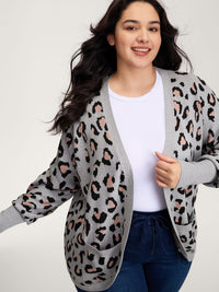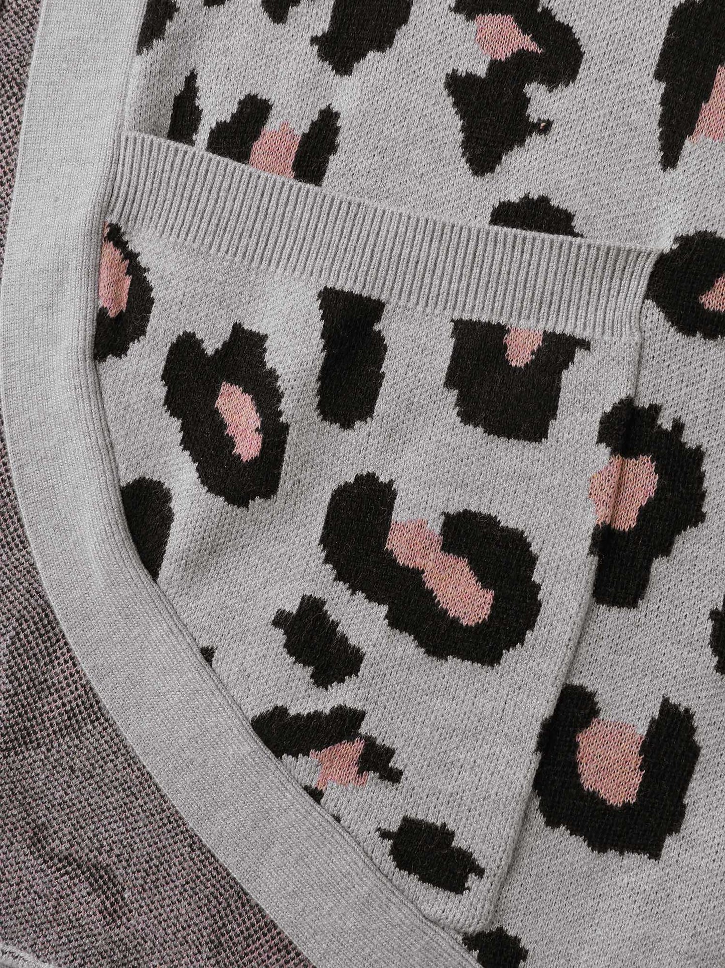 Leopard Print Arc Hem Pockets Knit Cardigan
