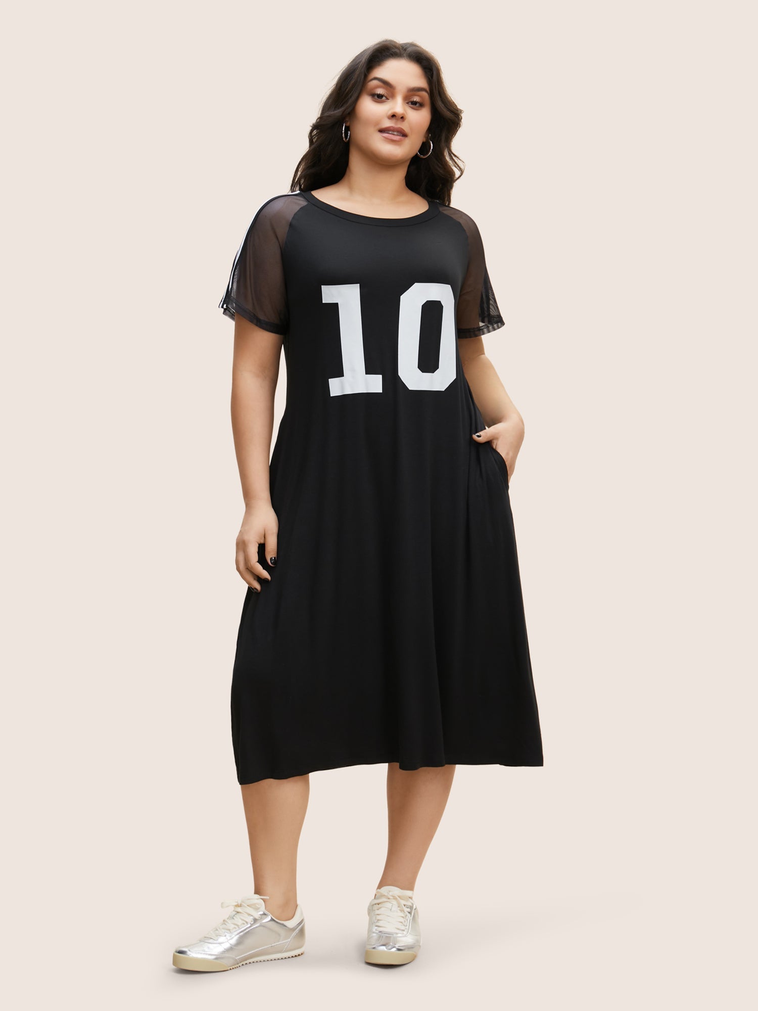Number Print Striped Mesh Patchwork Midi Dress
