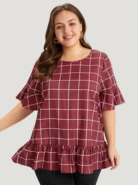 Plaid Frill Trim Bell Sleeve Flutter Hem Blouse