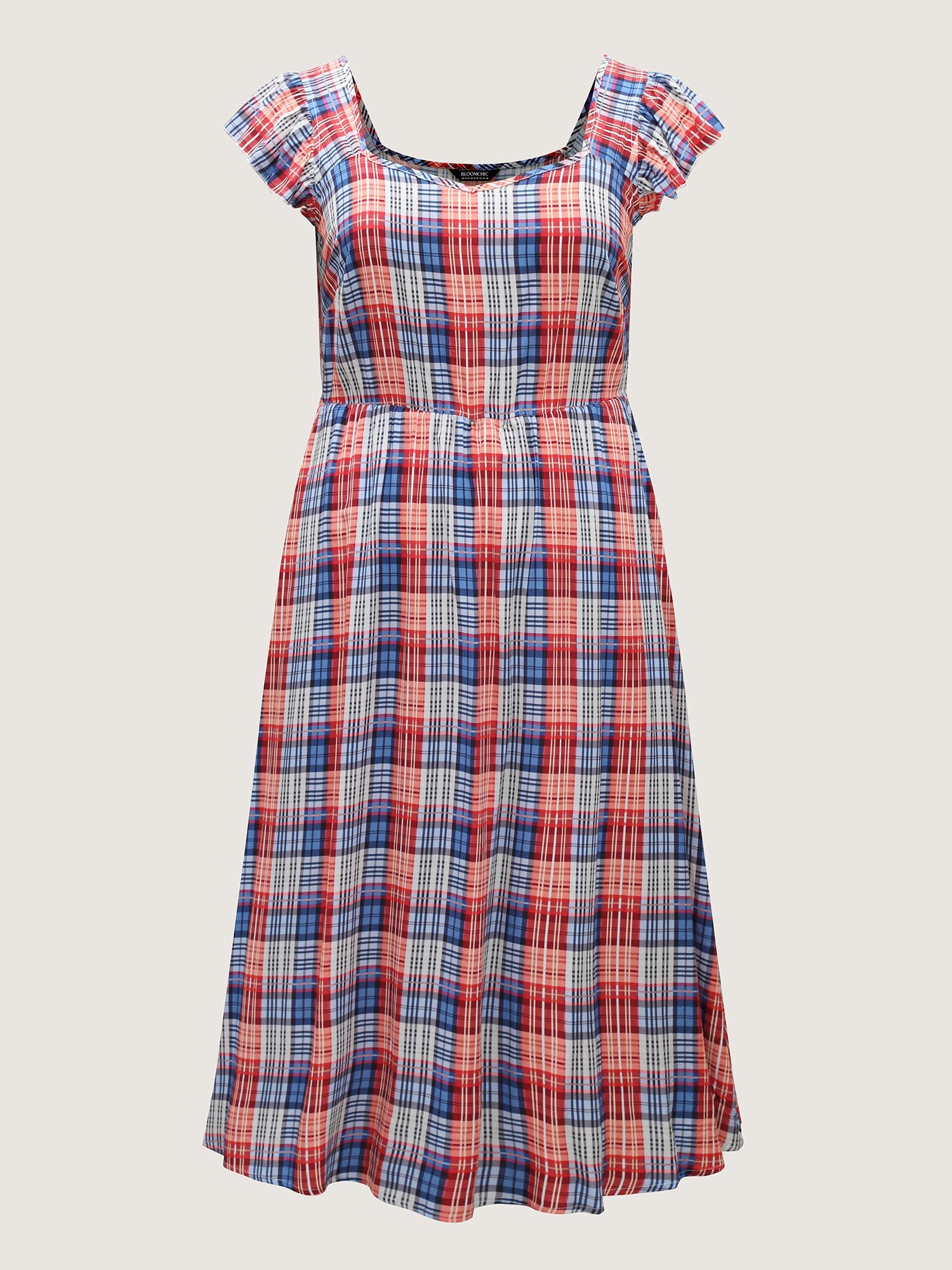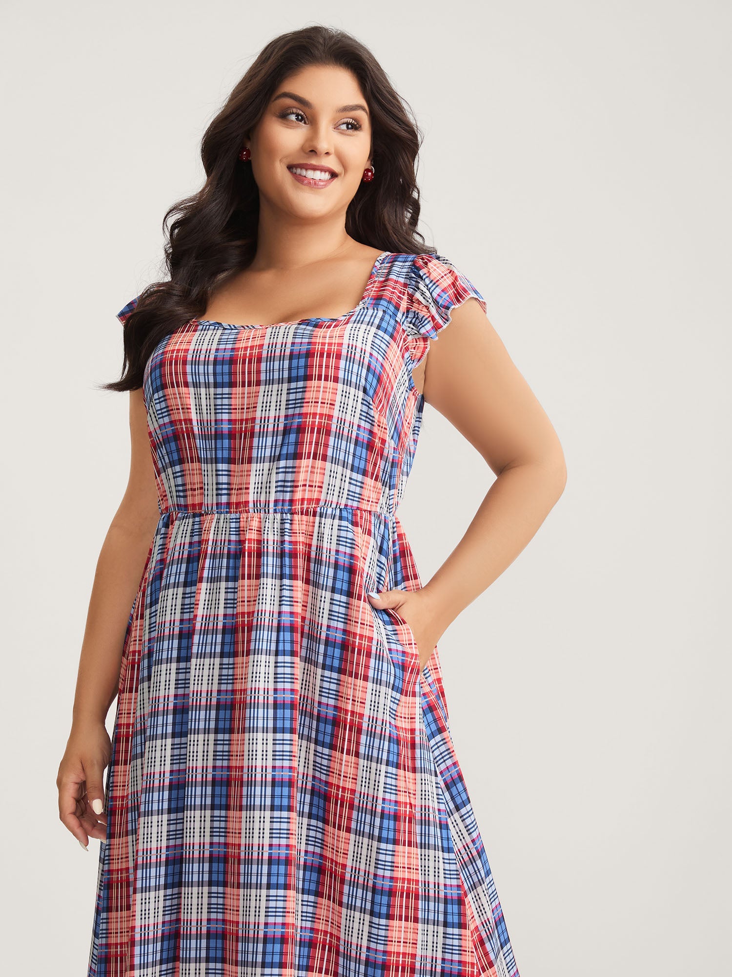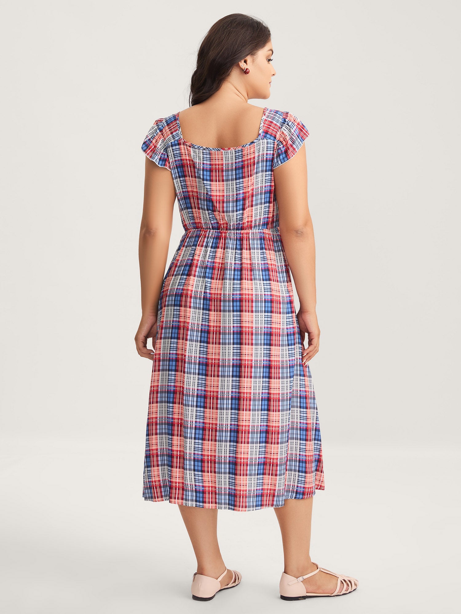 Plaid Print Flutter Sleeve Pockets Midi Dress