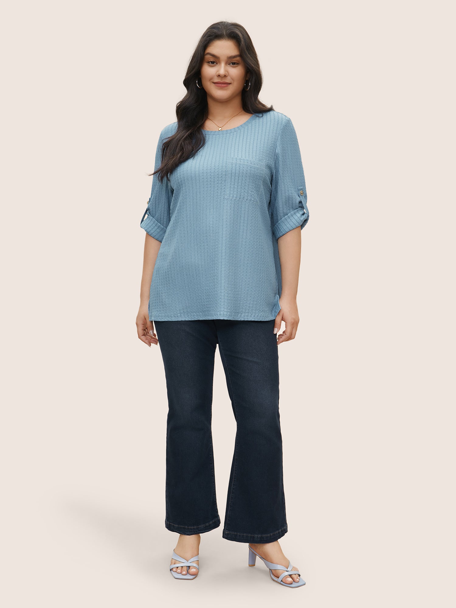 Plain Textured Patched Pocket Tab Sleeve T-shirt