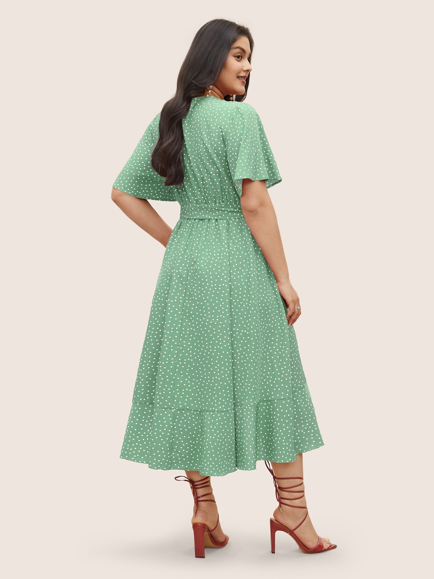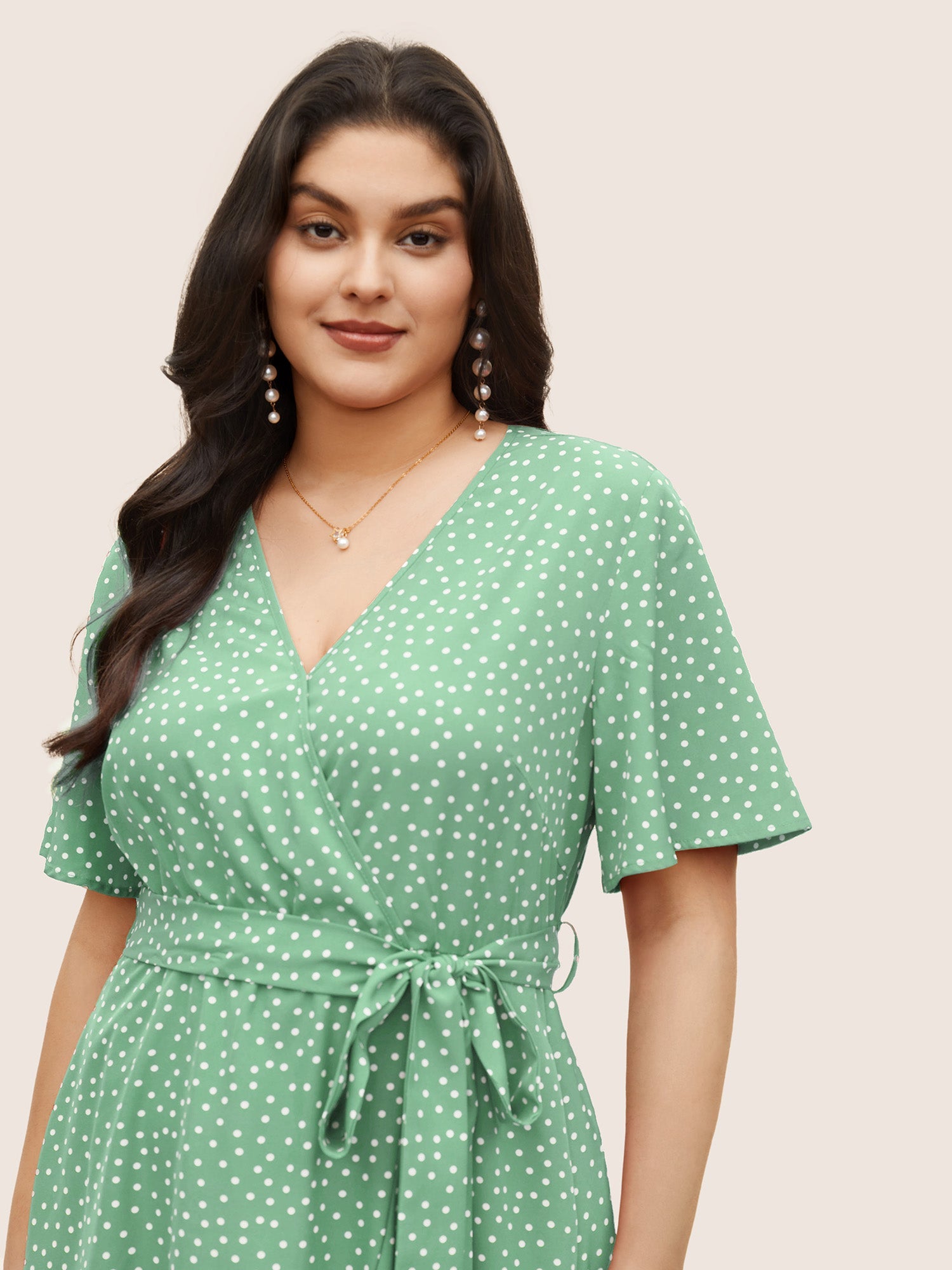 Polka Dot Surplice Neck Belted Arc Hem Dress