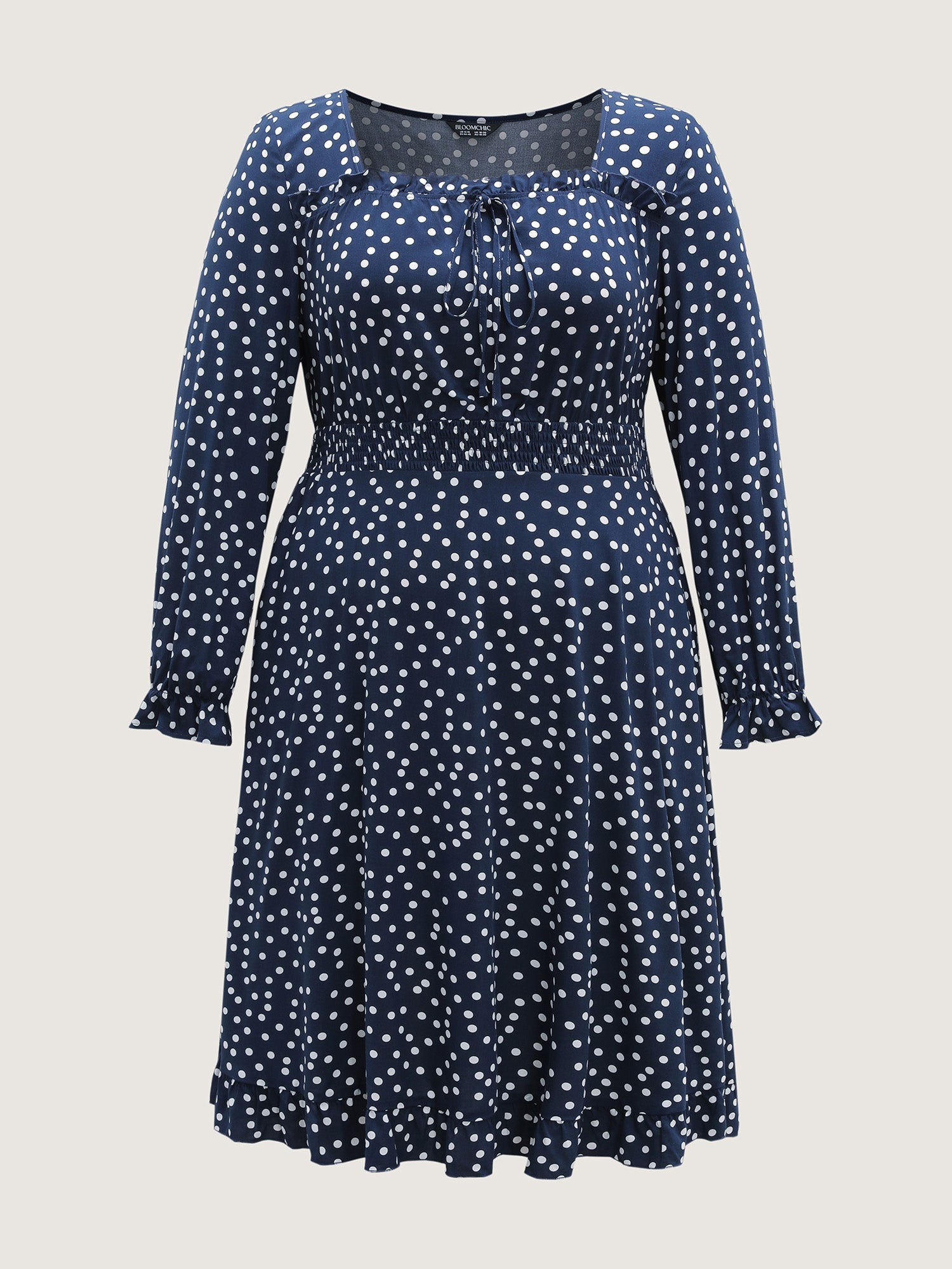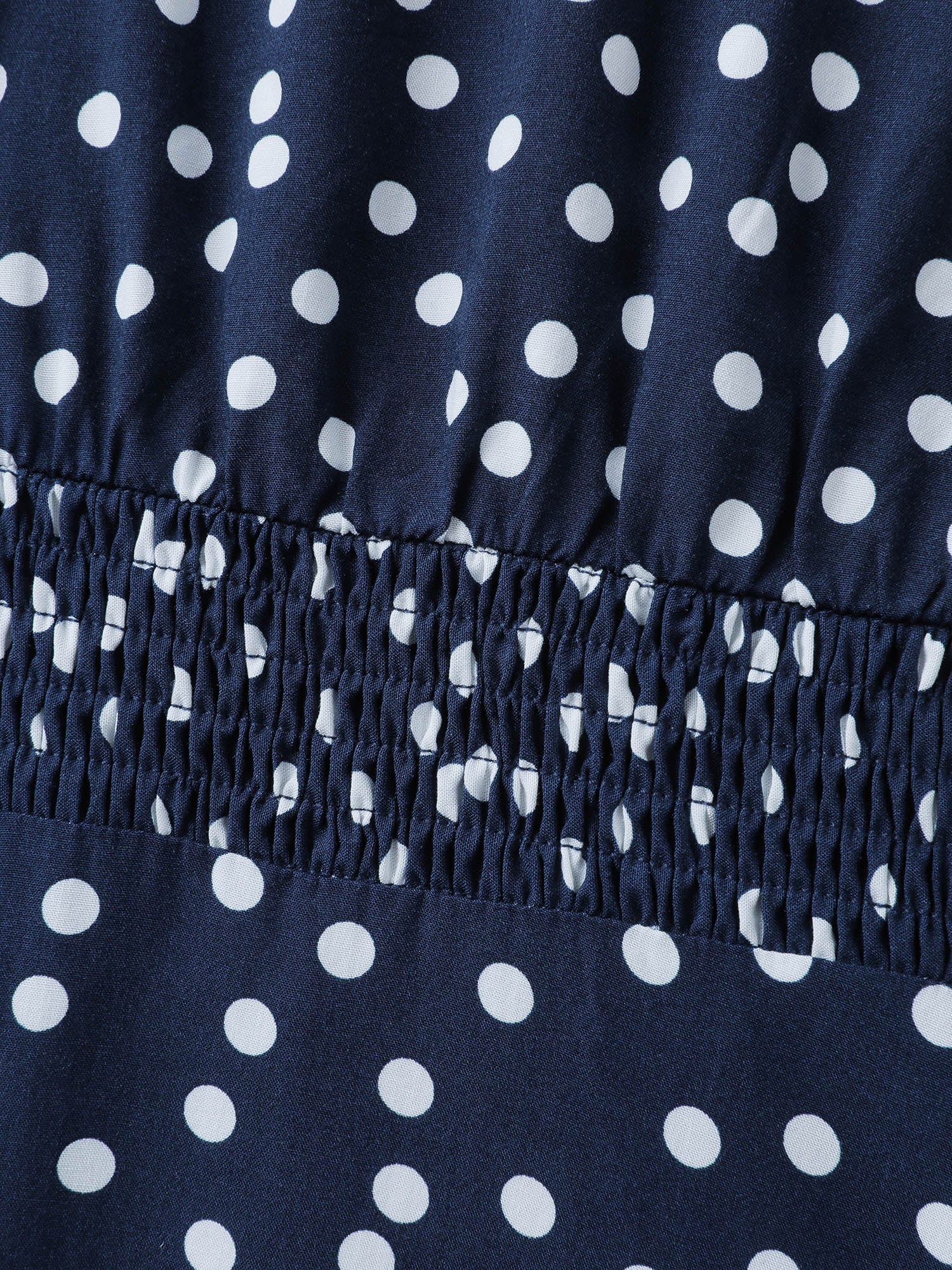 Polka Dots Shirred Drawstring Neck Midi Dress