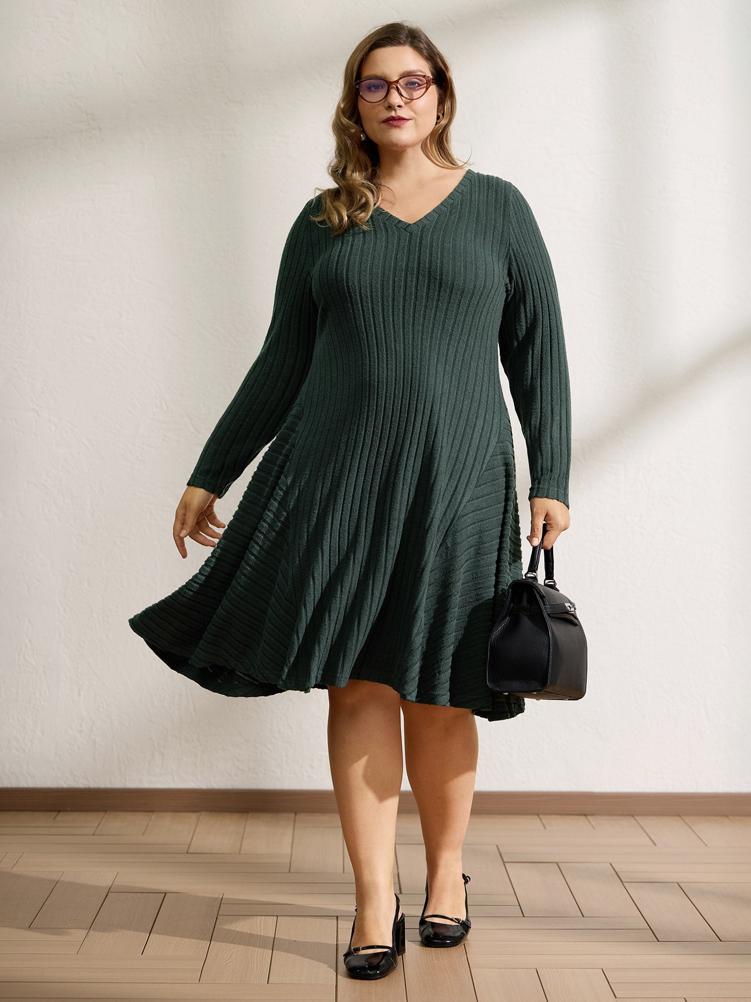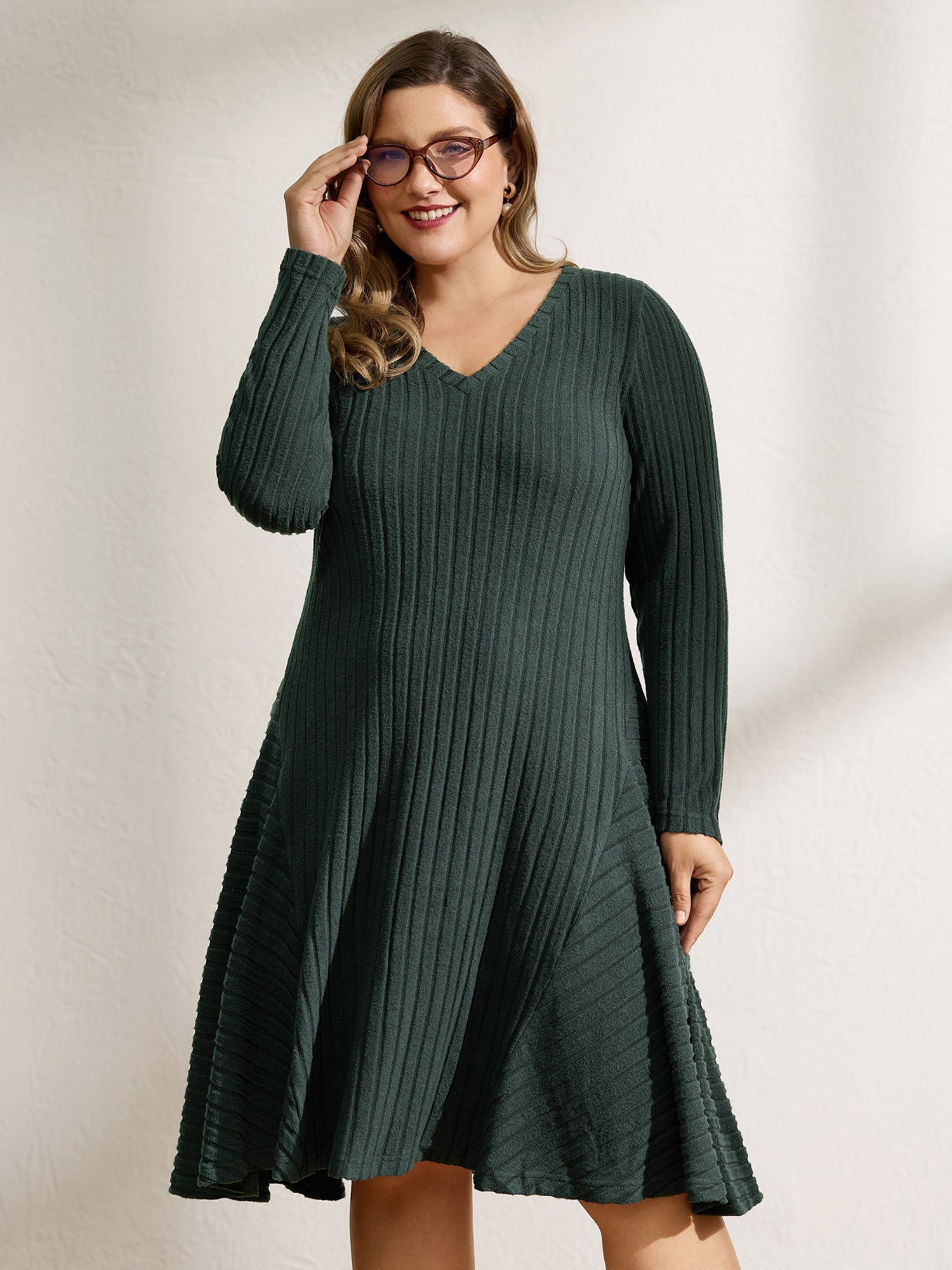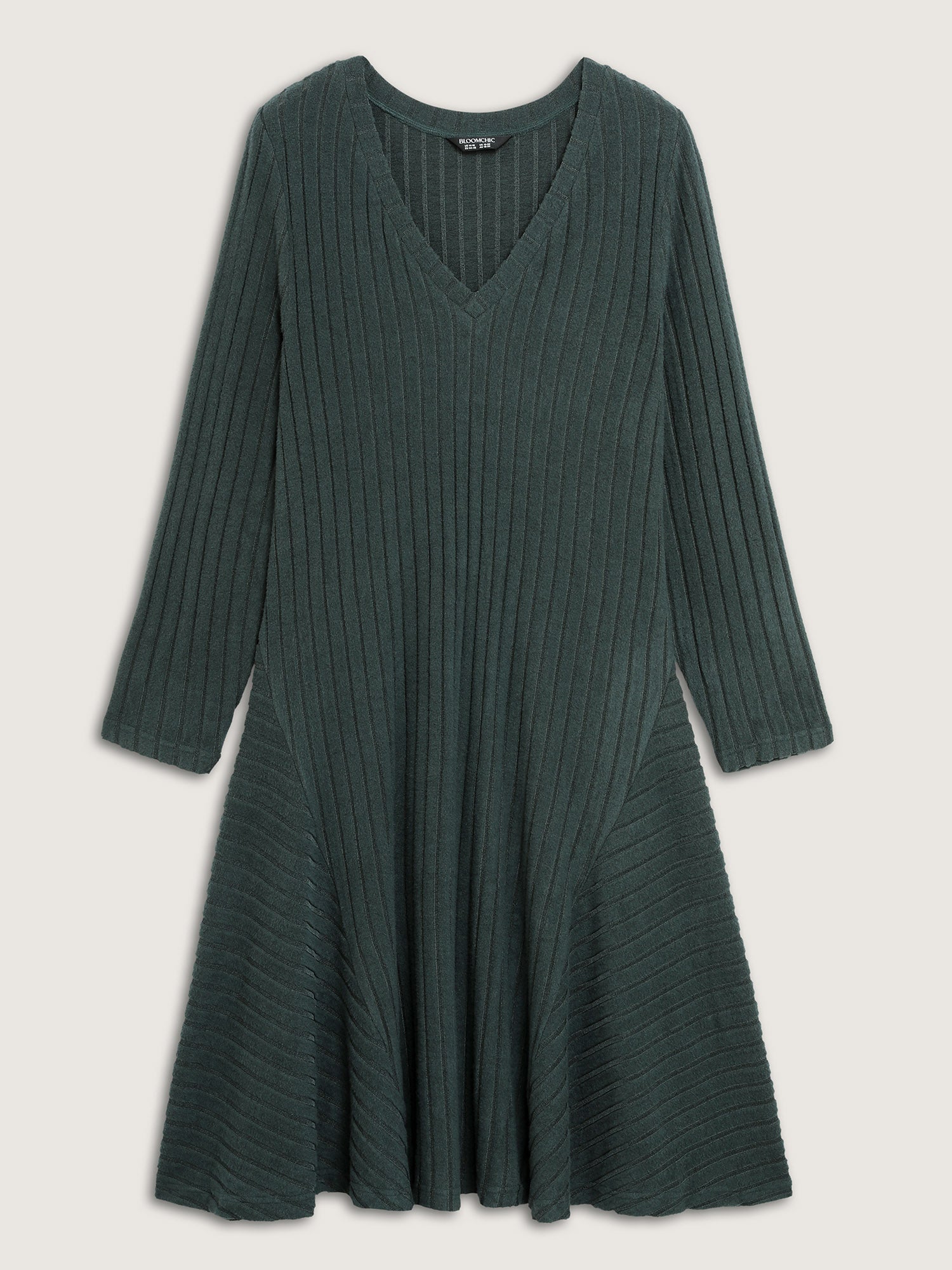Ribbed Fleece V-Neck Knit Midi Dress