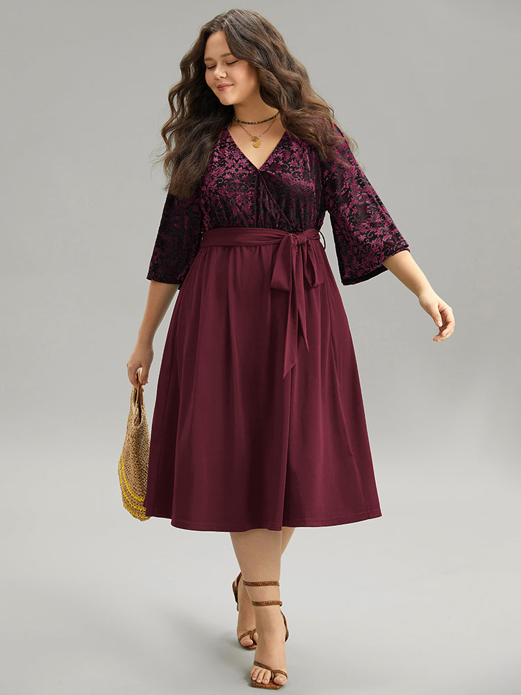 Silhouette Floral Print Belted Patchwork Velvet Dress