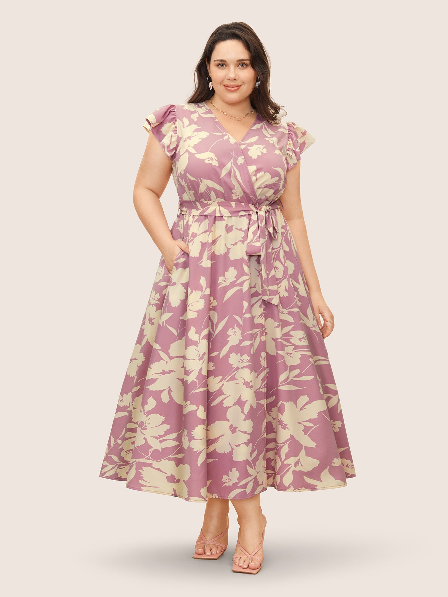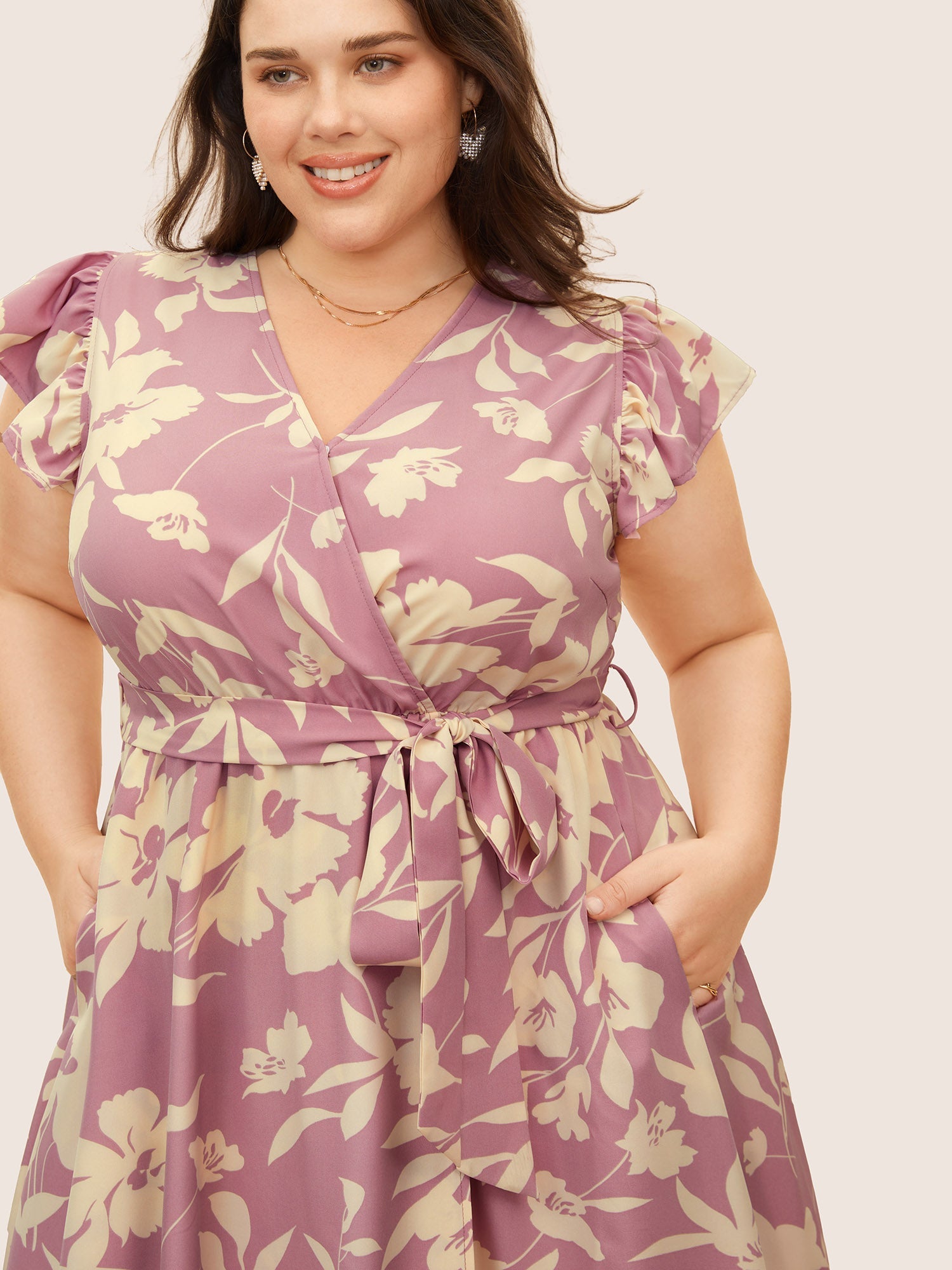 Silhouette Floral Print Wrap Ruffle Cap Sleeve Dress