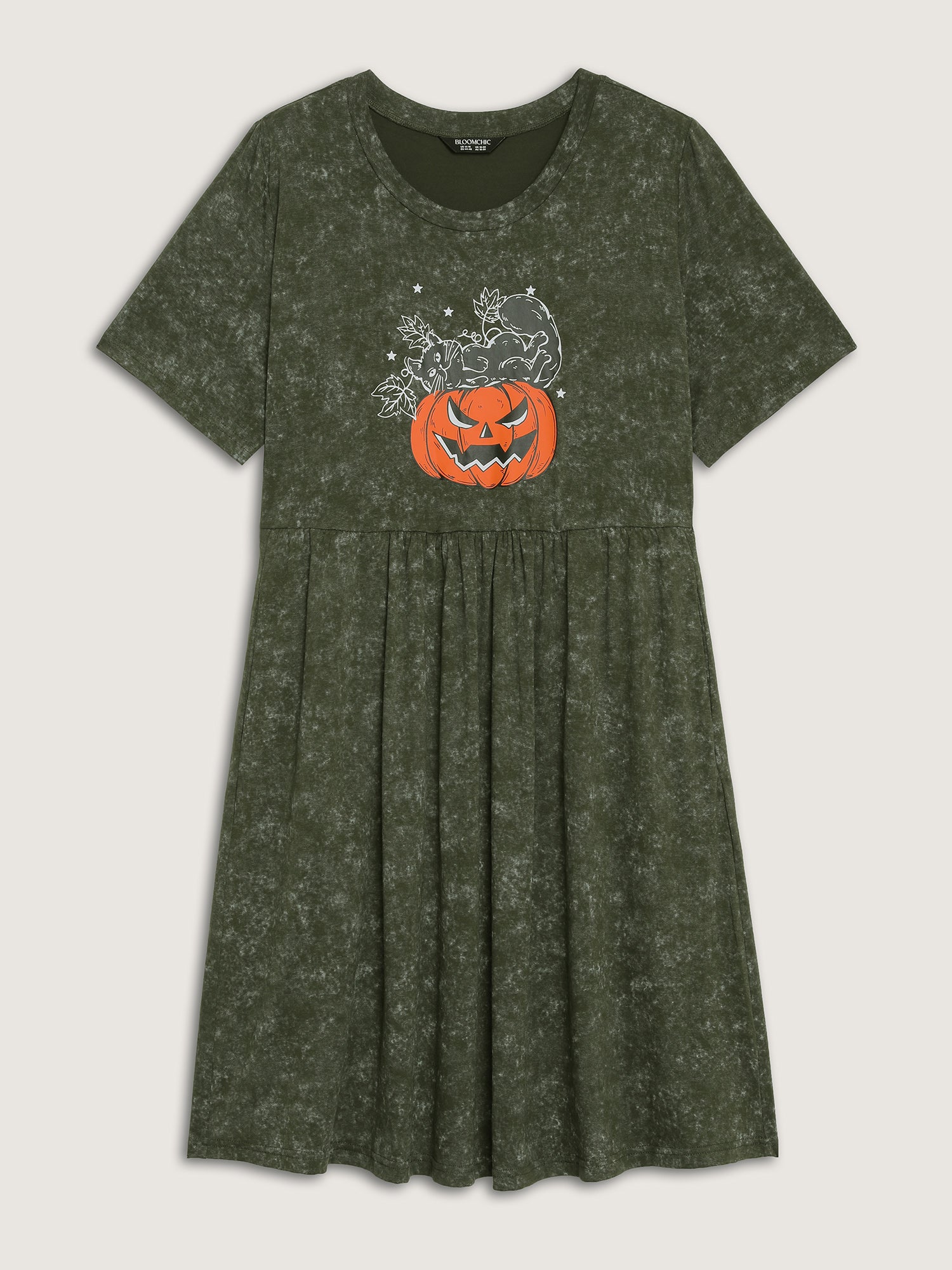 Spooky Pumpkin Motif Snowflake Effect Midi Dress
