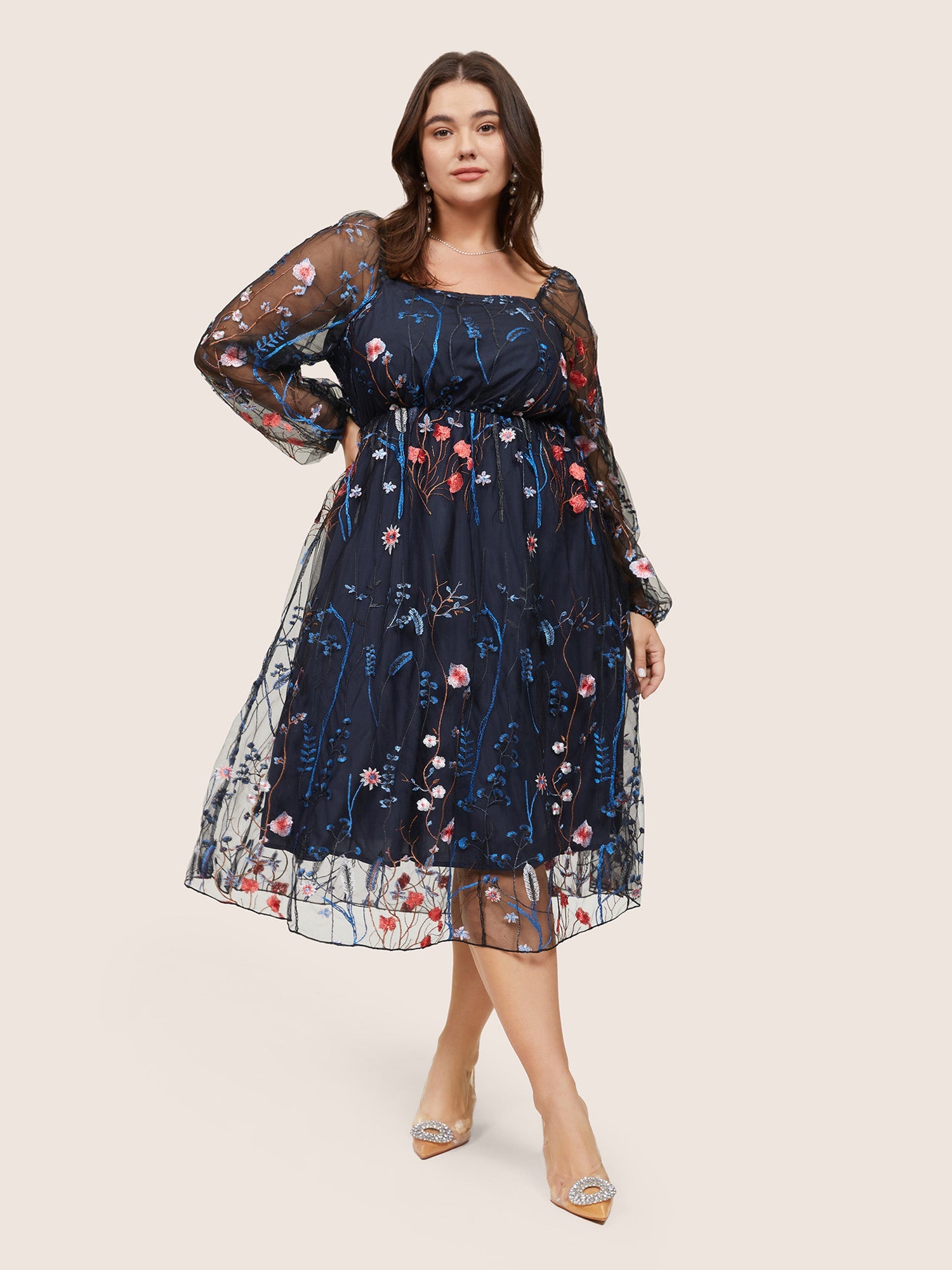 Square Neck Embroidered Lace Mesh Lantern Sleeve Dress
