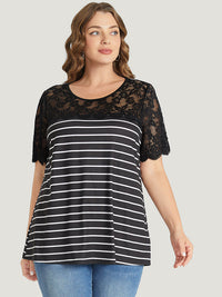 Striped Patchwork Lace Scalloped Trim T-shirt