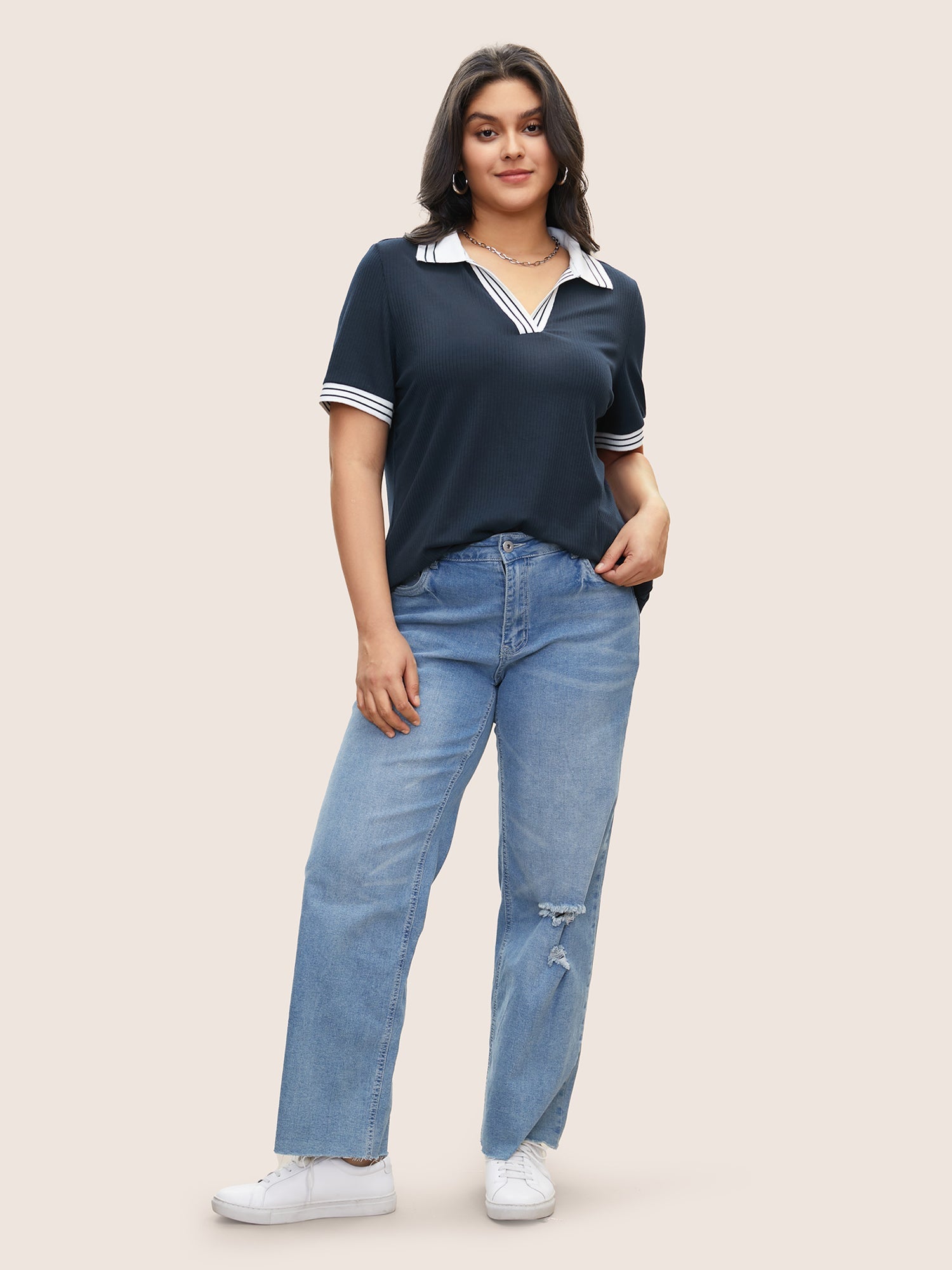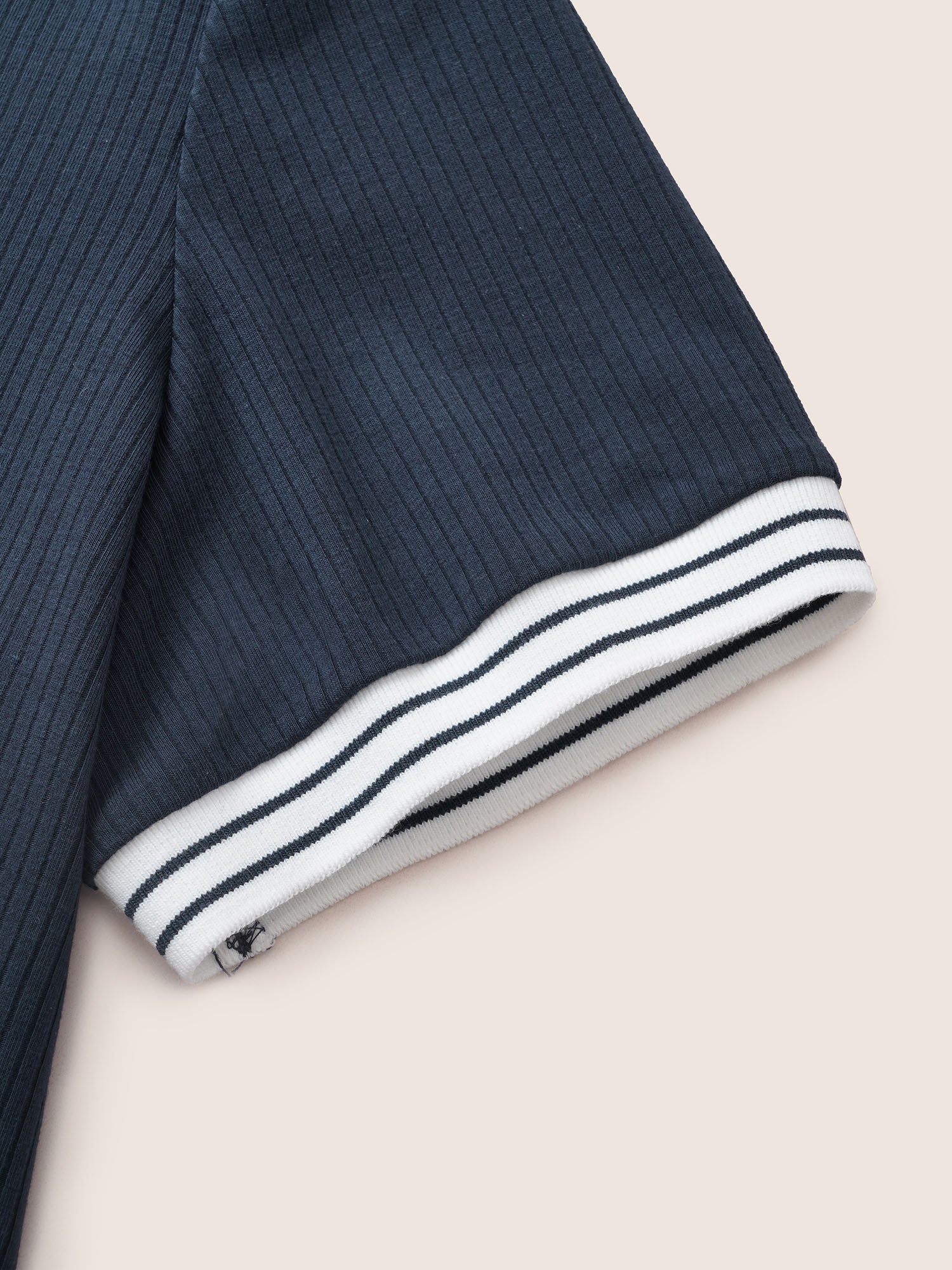 Striped Patchwork Polo Neck Rib Knit T-shirt