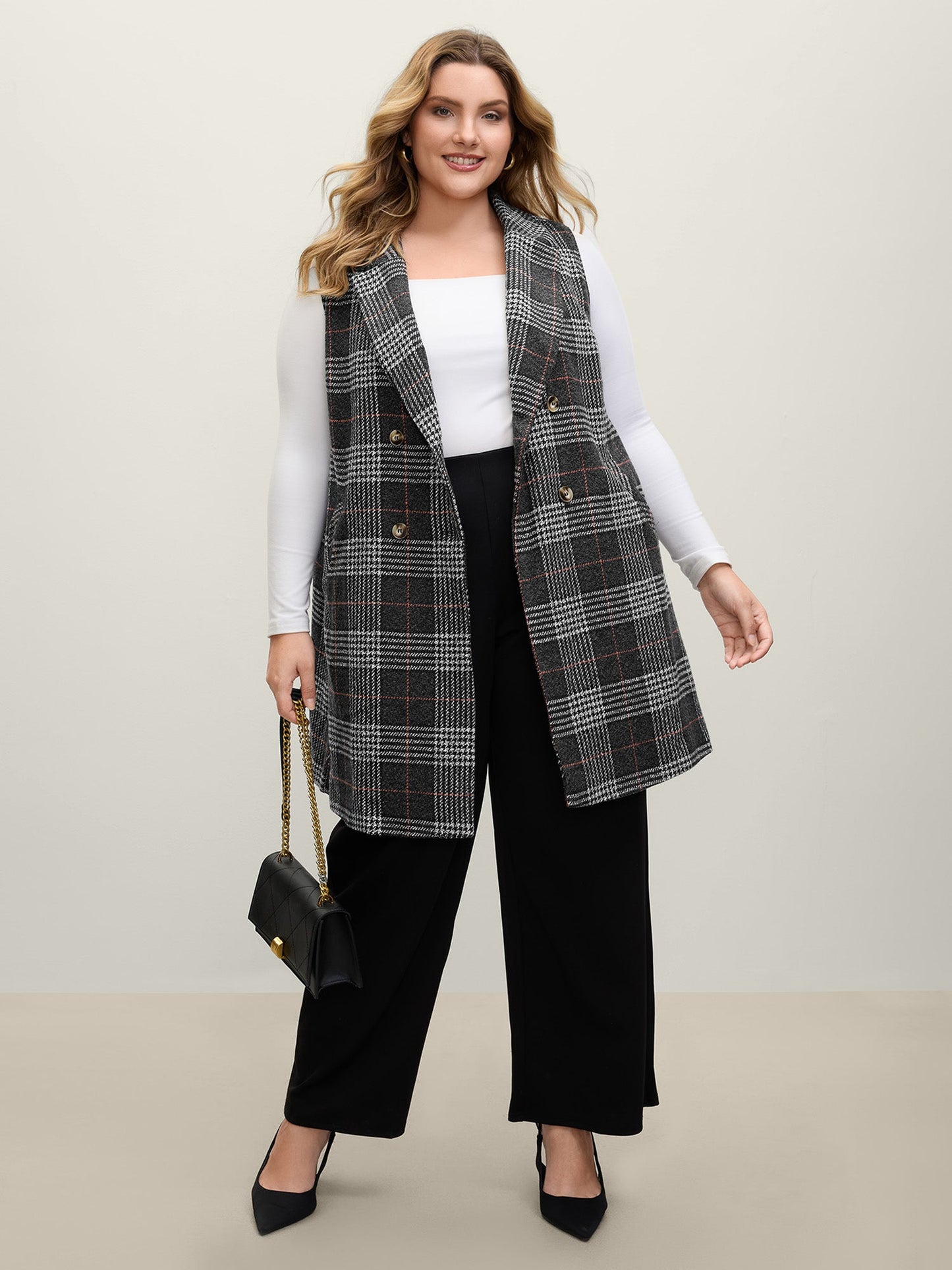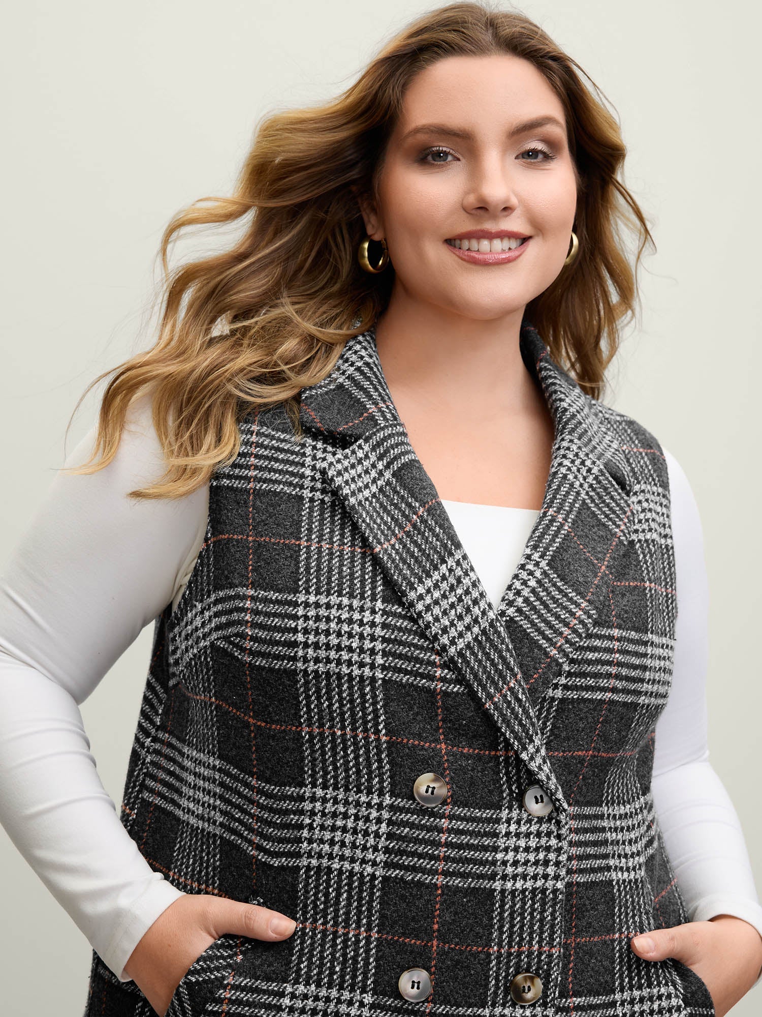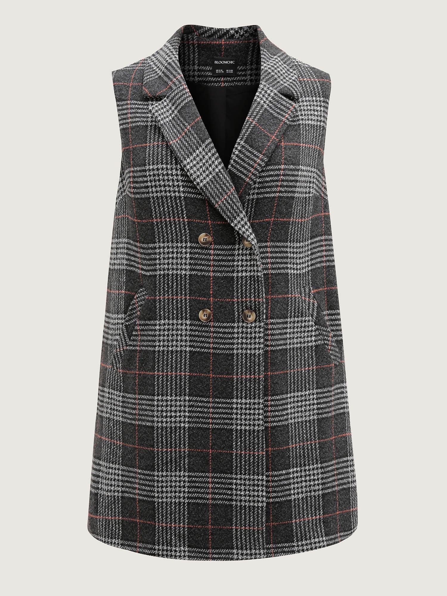 Textured Plaid Pattern Pockets Long Vest