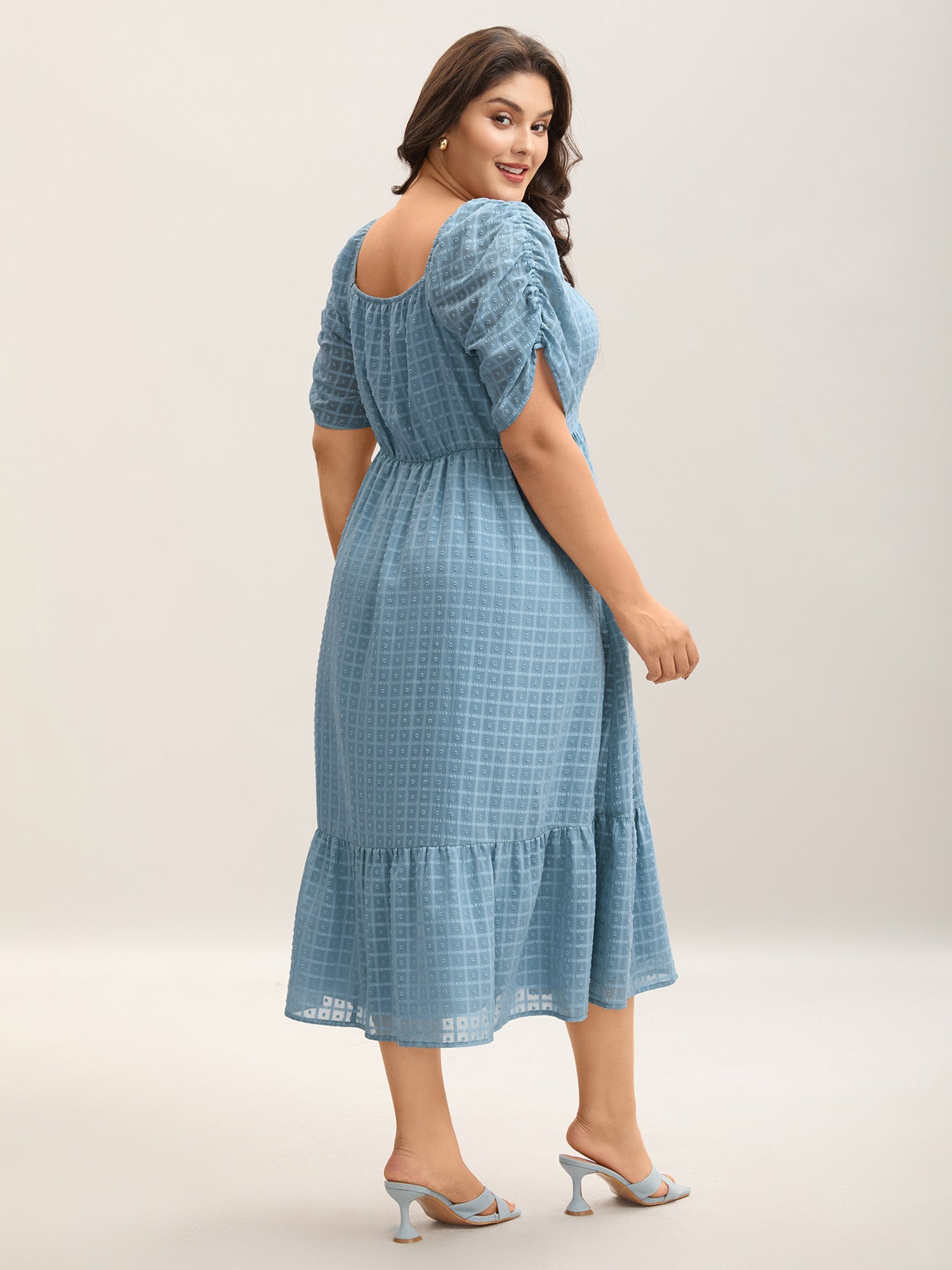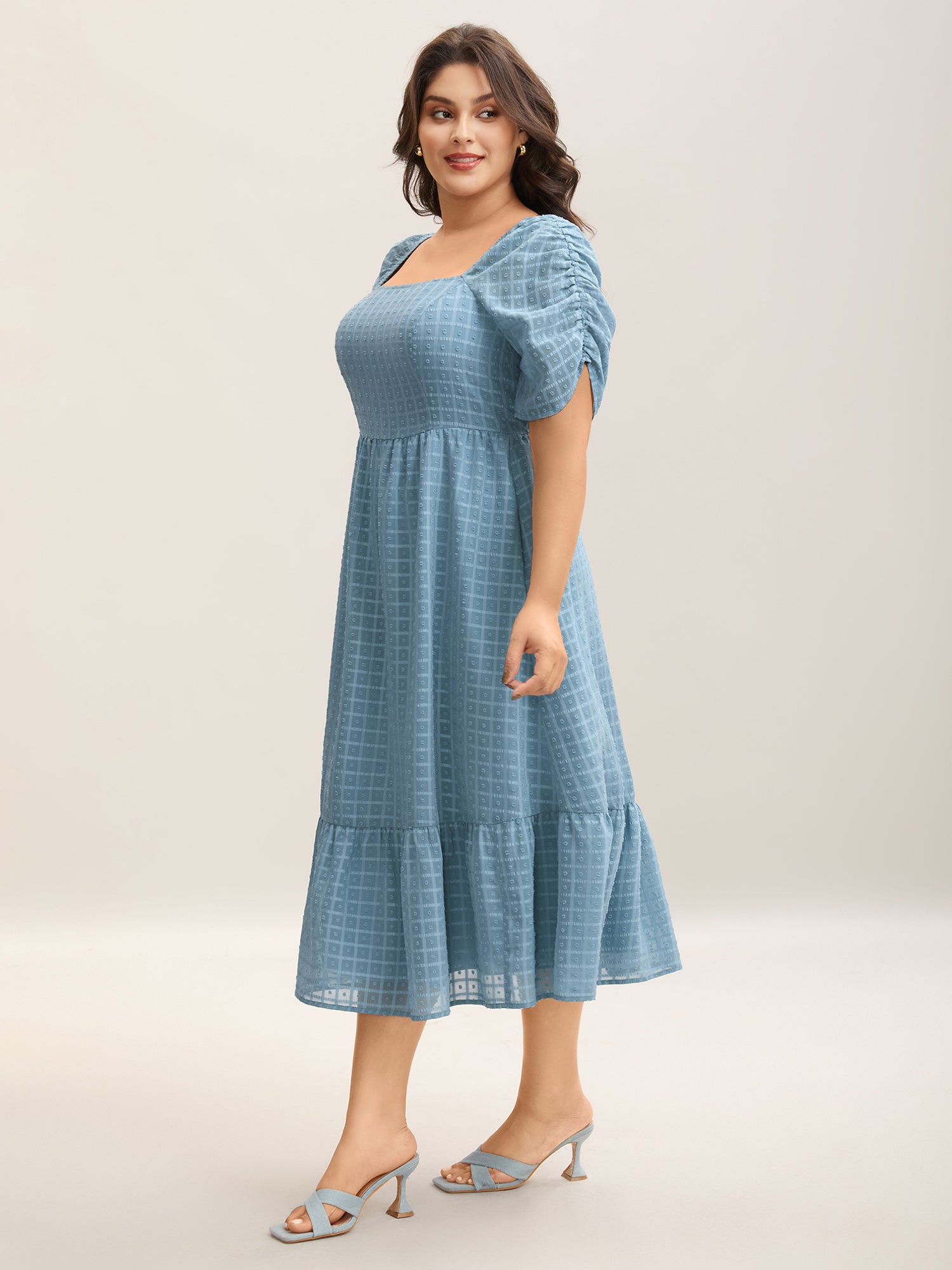Textured Ruched Sleeve Tiered Midi Dress