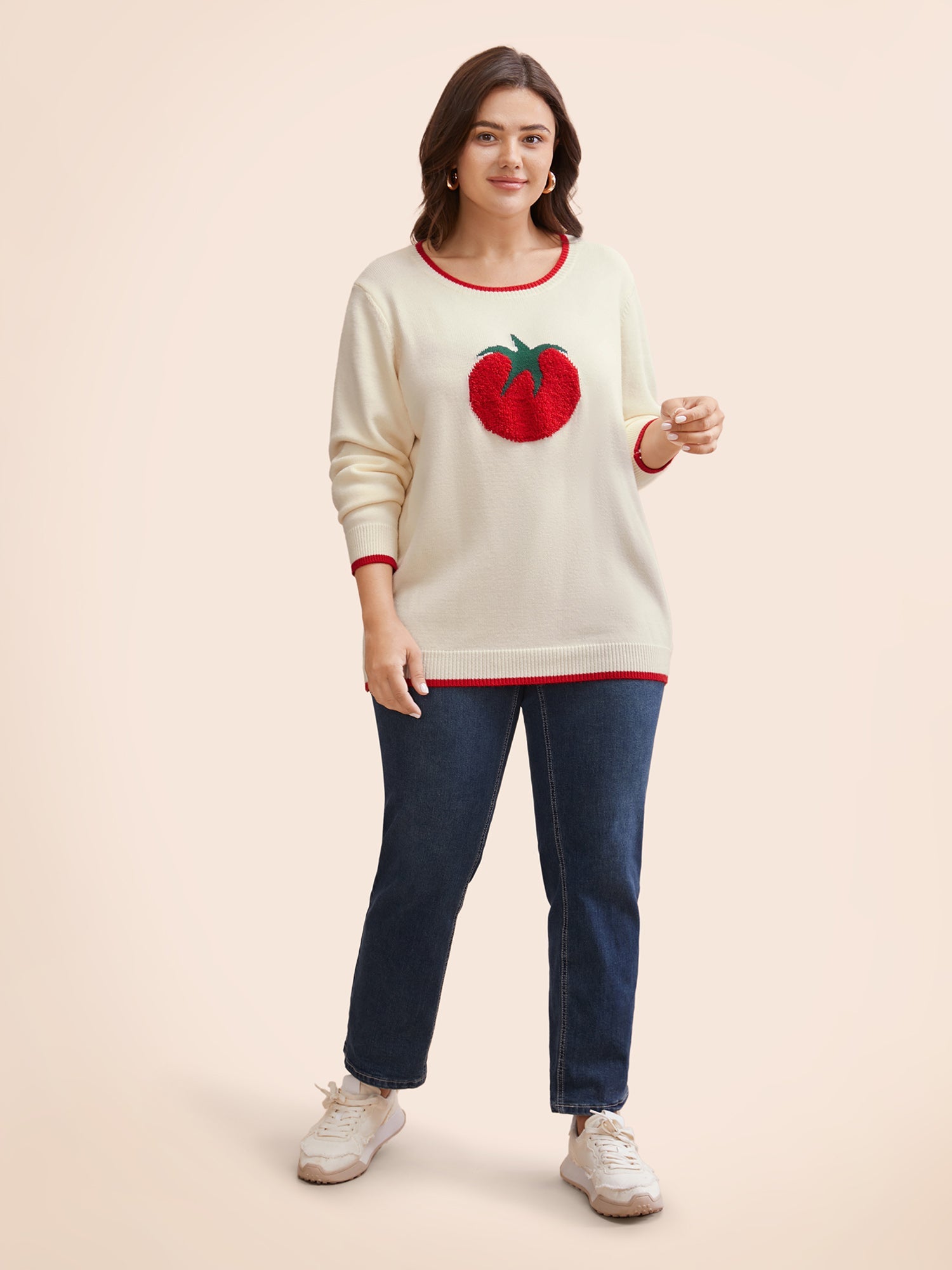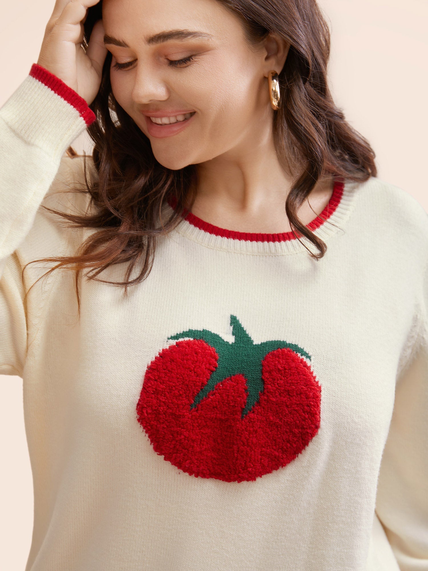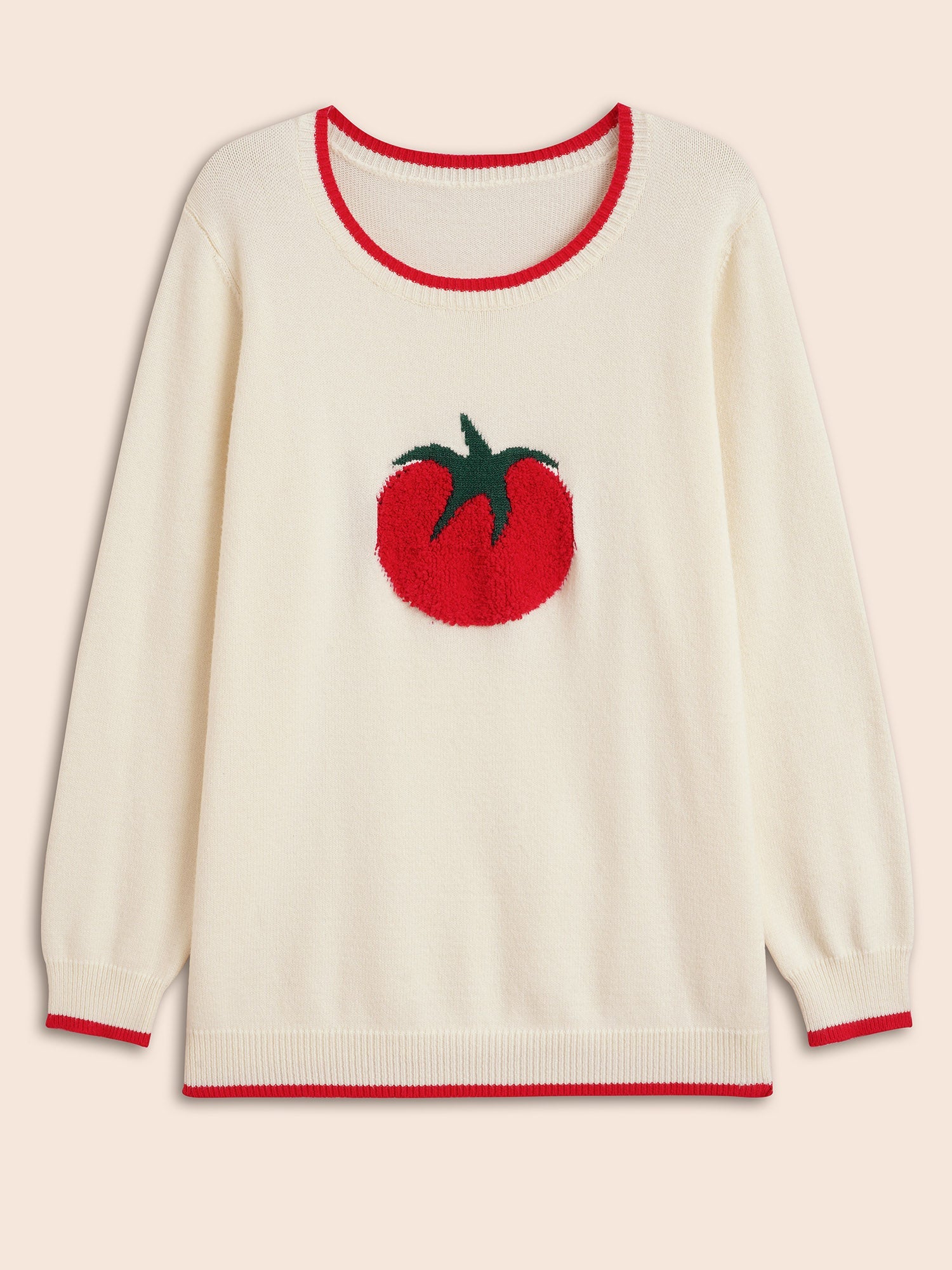 Tomato Pattern Embroidered Contrast Trim Pullover
