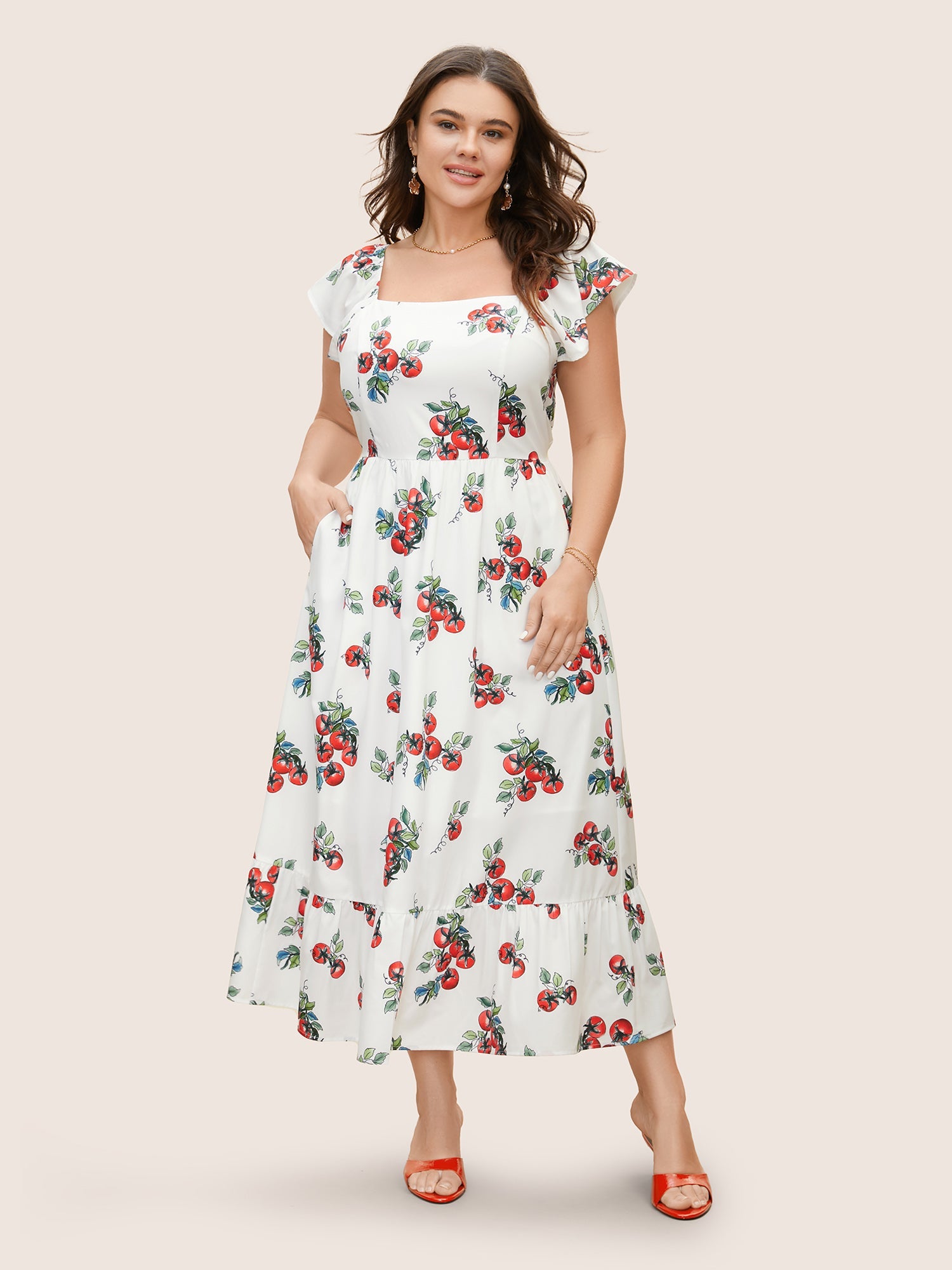 Tomato Print Square Neck Ruffle Cap Sleeve Dress
