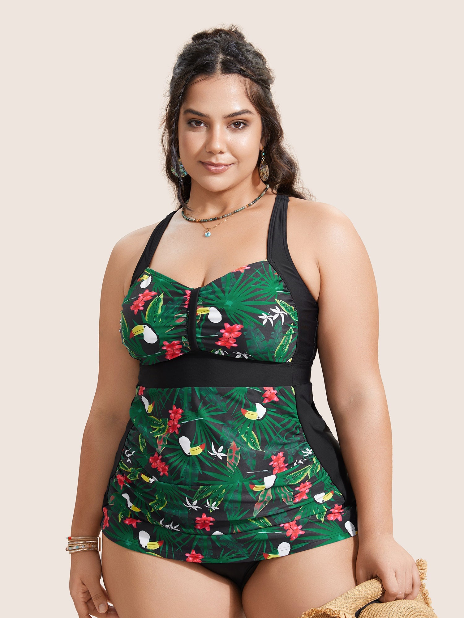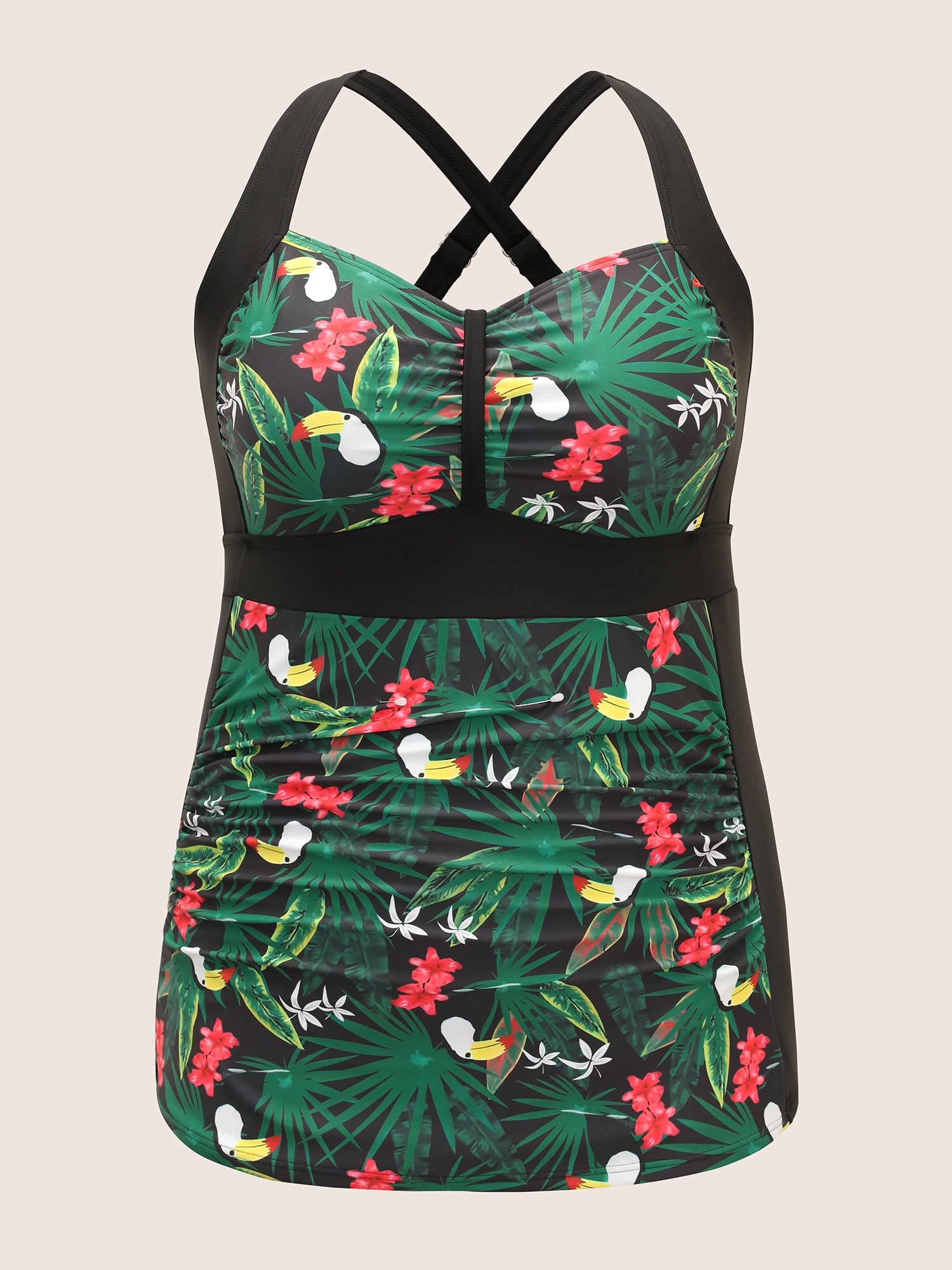 Tropical Print Patchwork Gathered Swim Top