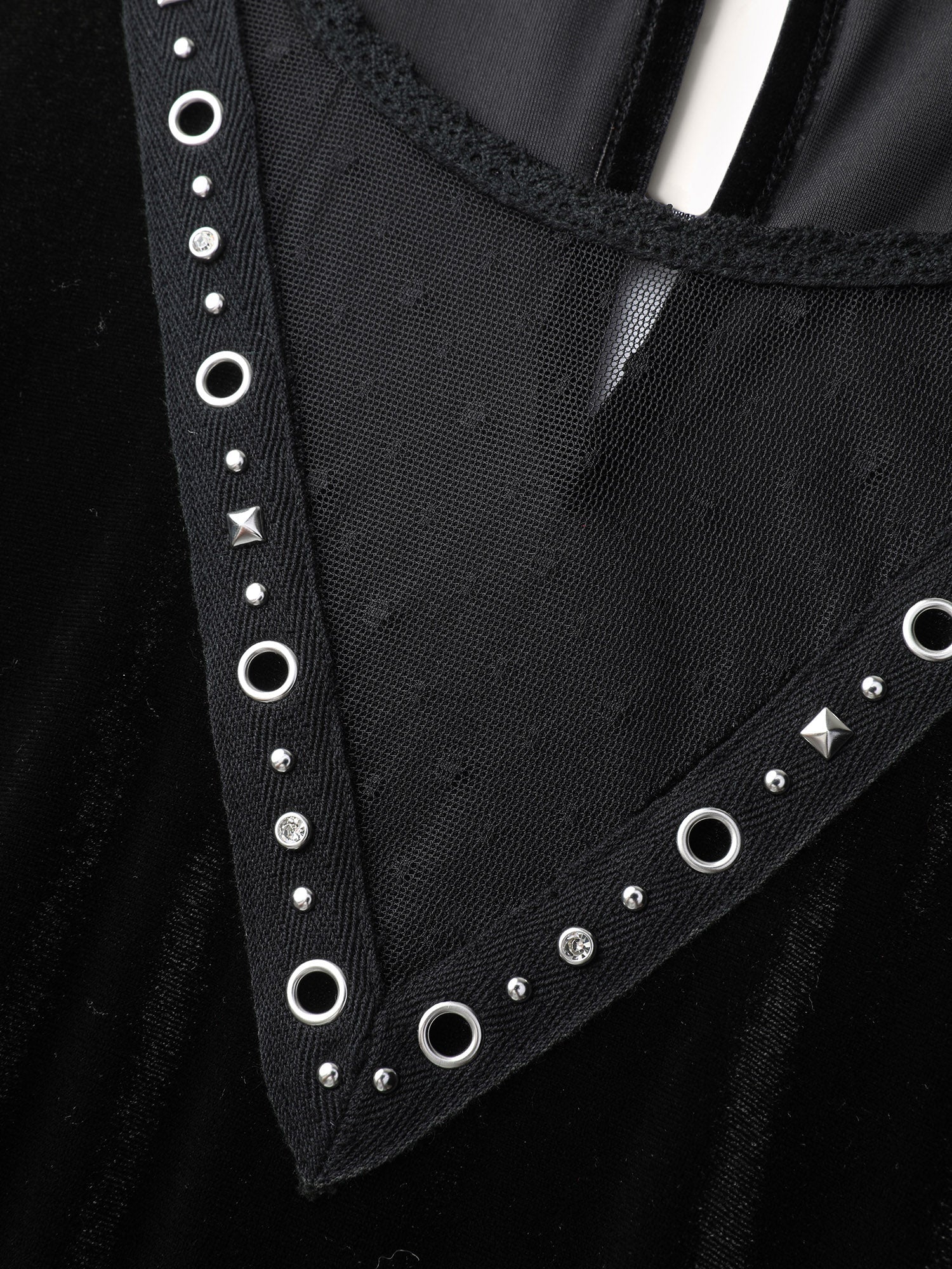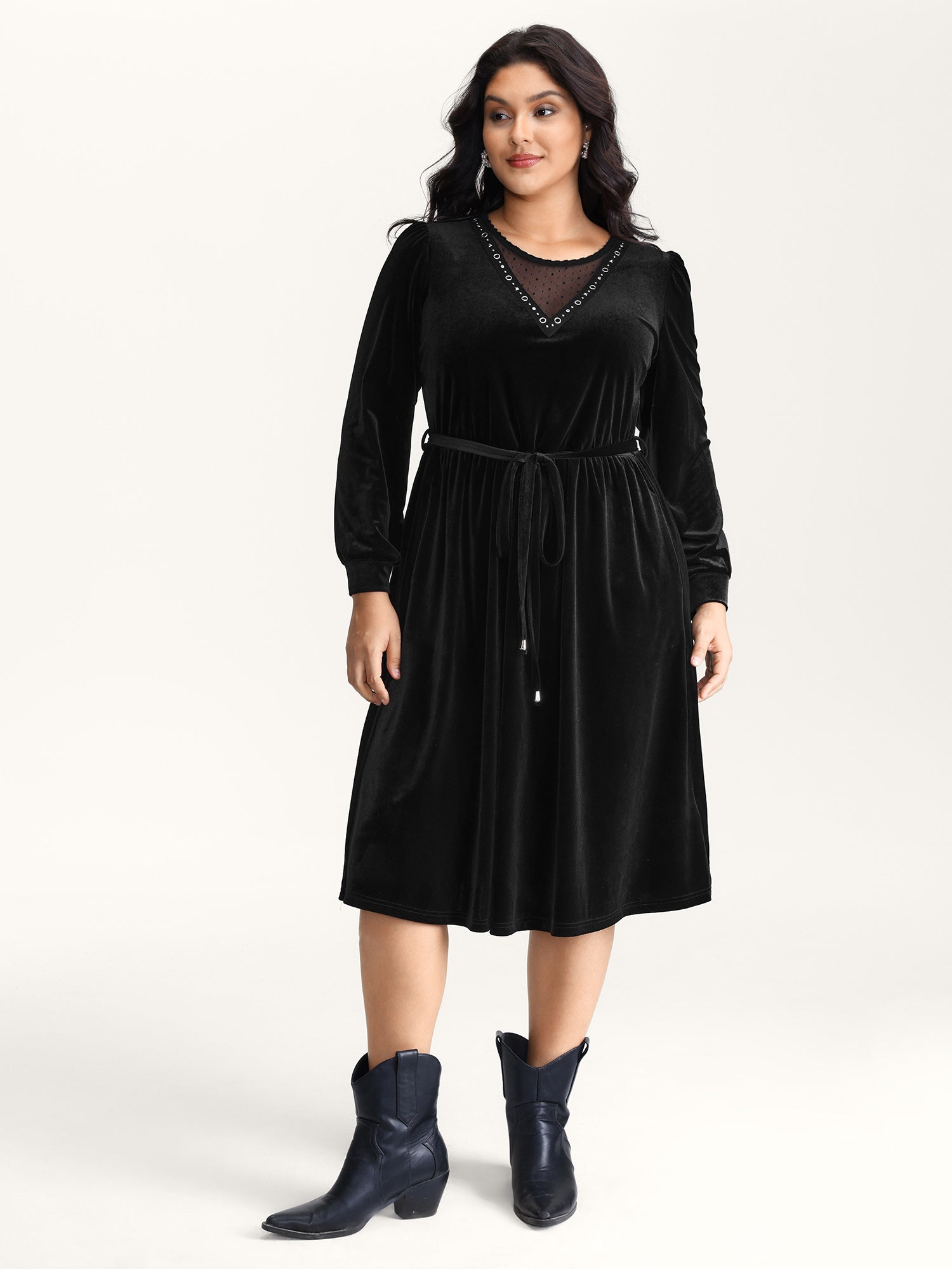 Velvet Sheer Neckline Belted Waist Maxi Dress