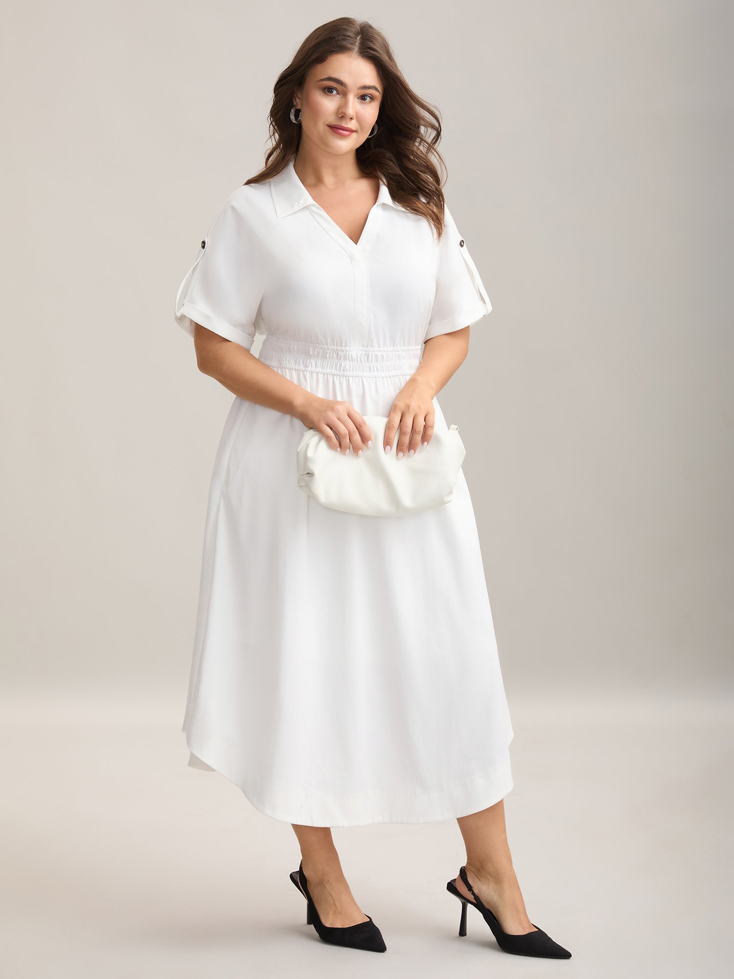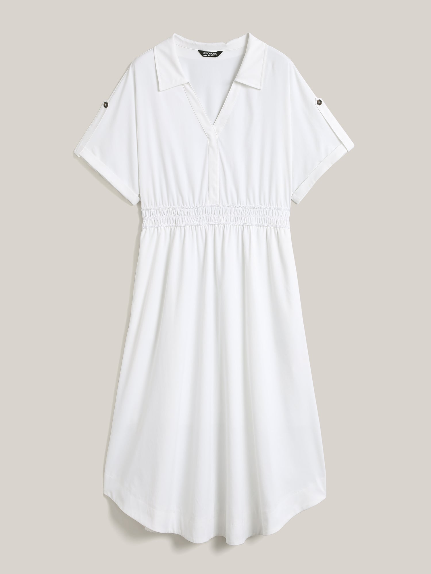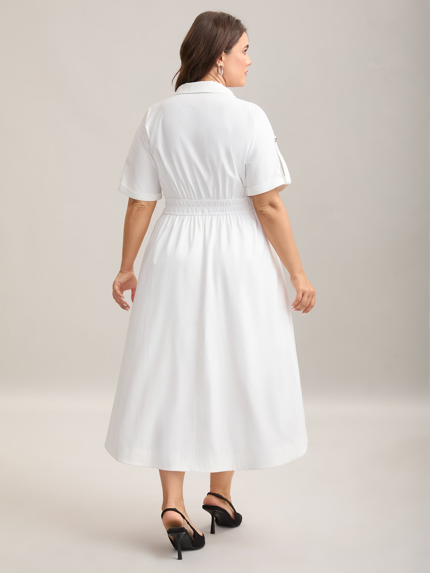 Woven Shirred Waist Solid Collar Midi Dress